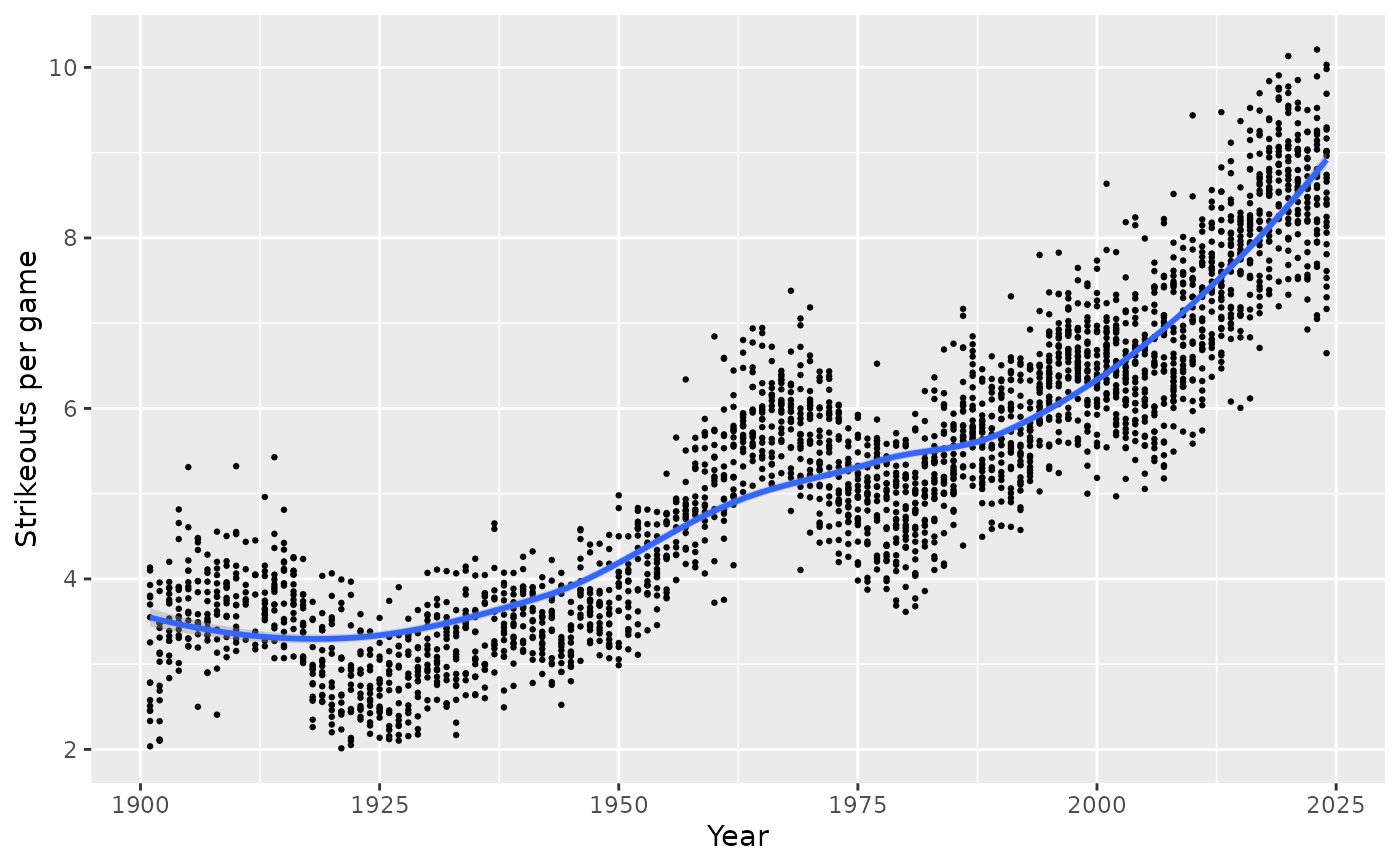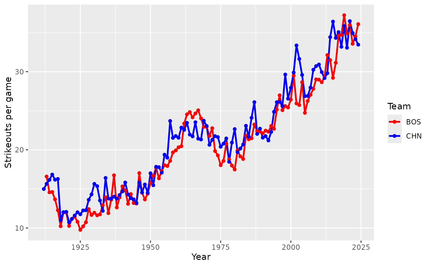 labs(x = "Year", y = "Strikeouts per game", color = "Team") +