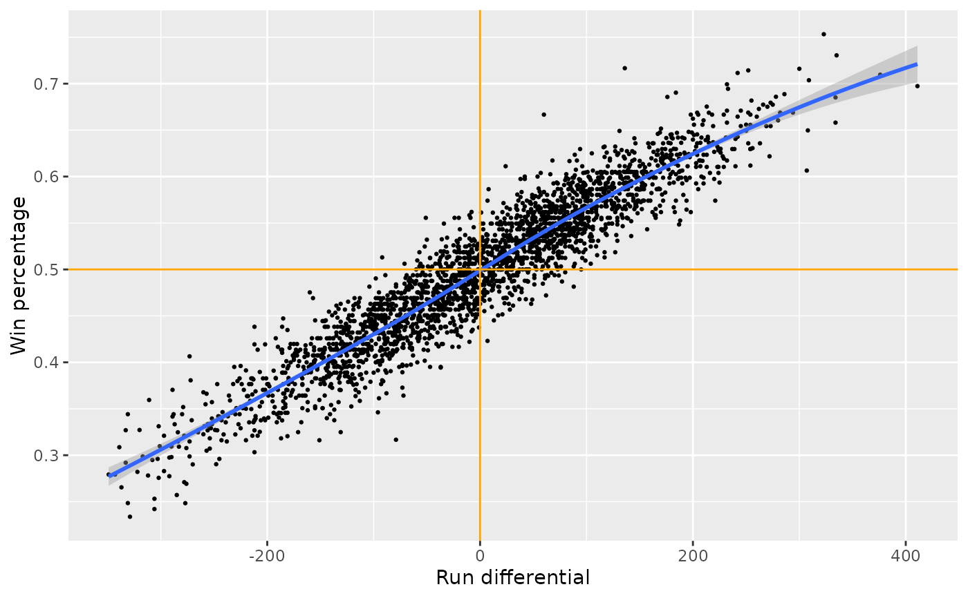 ## Plot win percentage vs. run differential (R - RA)