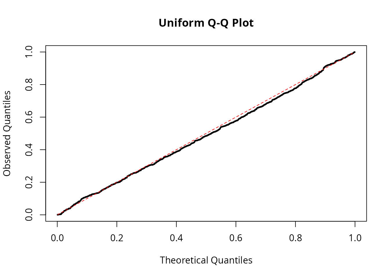 To verify that the values in are approximately uniformly distributed, we construct a Q-Q plot, which compares the quantiles of the observed values in to the theoretical quantiles of the distribution. For the theoretical quantiles, we use the plotting positions , which avoid the extremes of 0 and 1 and are commonly used in Q-Q plotting for Uniform distributions. If the values in follow a uniform distribution, the Q-Q plot will closely follow a 45-degree reference line, indicating good agreement between the empirical and theoretical quantiles. That is exactly what we observe.