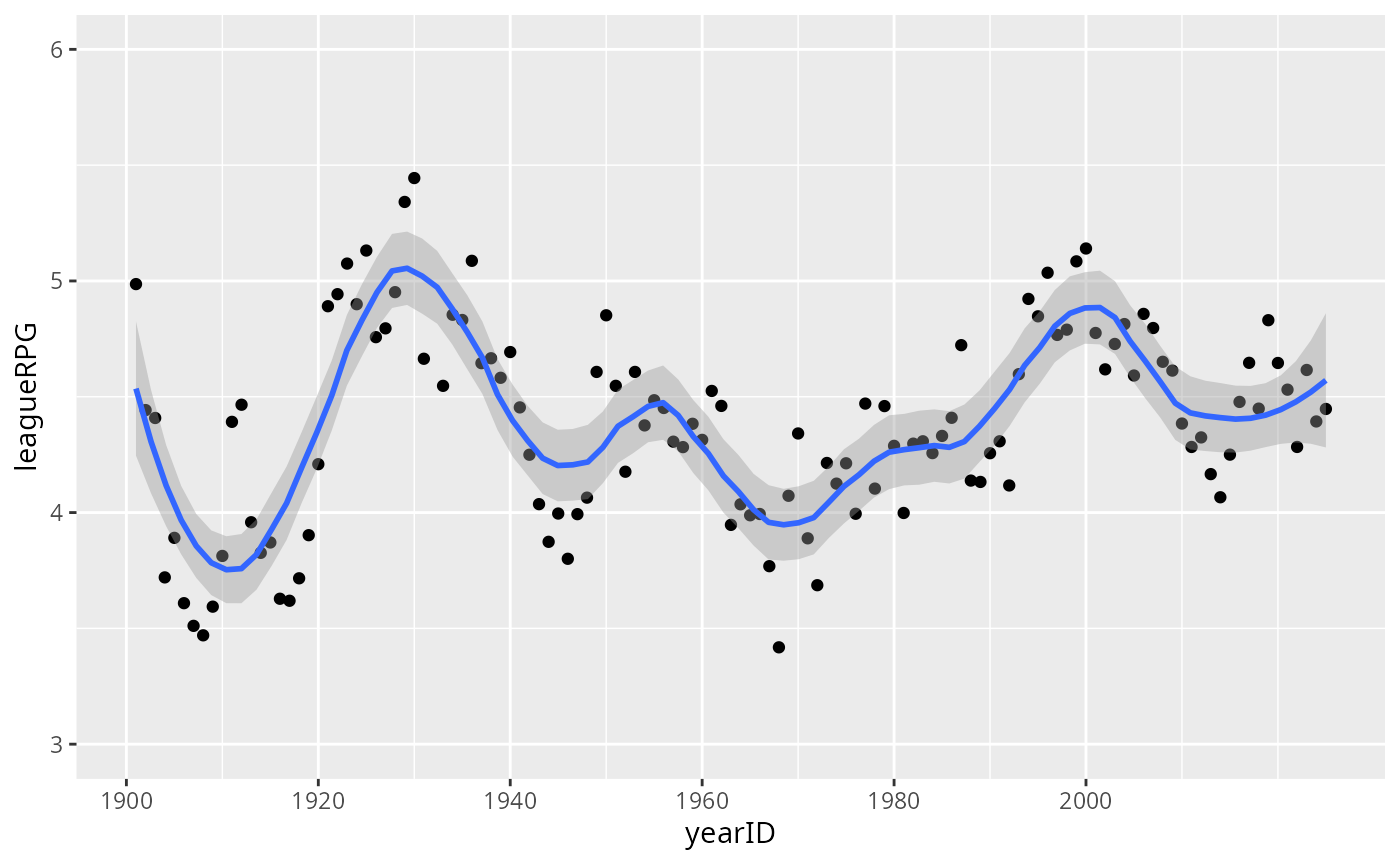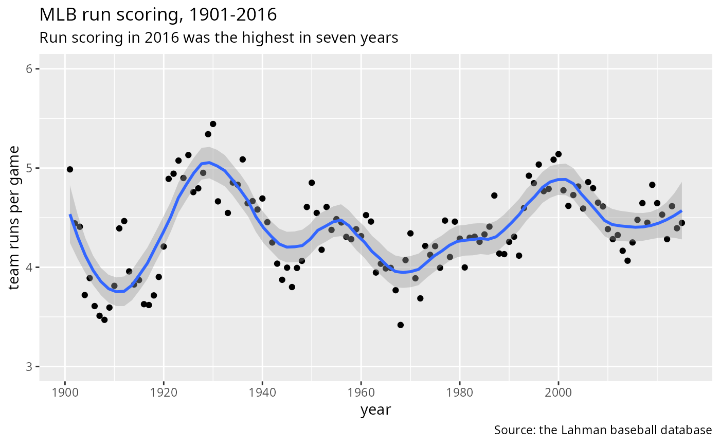 So now we have a nice looking dot plot showing the average number of runs scored per game for the years 1901-2016. (The 2016 data is the most recent that has been added to the database.)