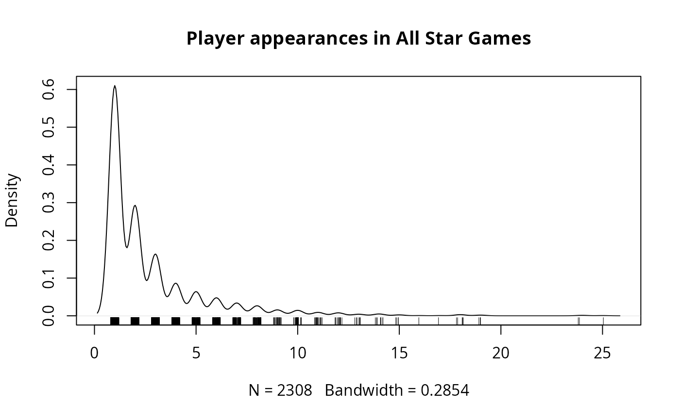 plot(density(player_appearances), main="Player appearances in All Star Games")
