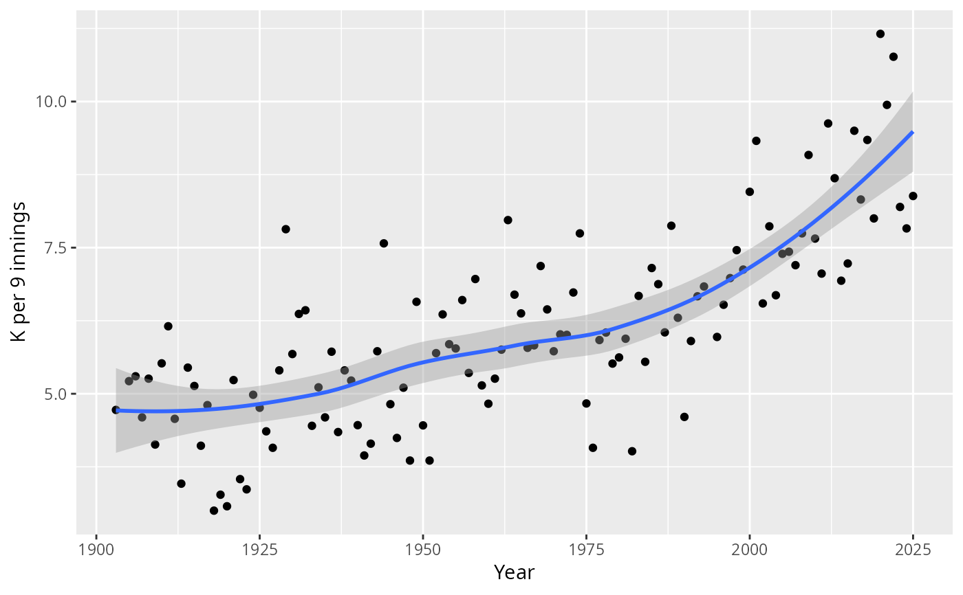 labs(x = "Year", y = "K per 9 innings")