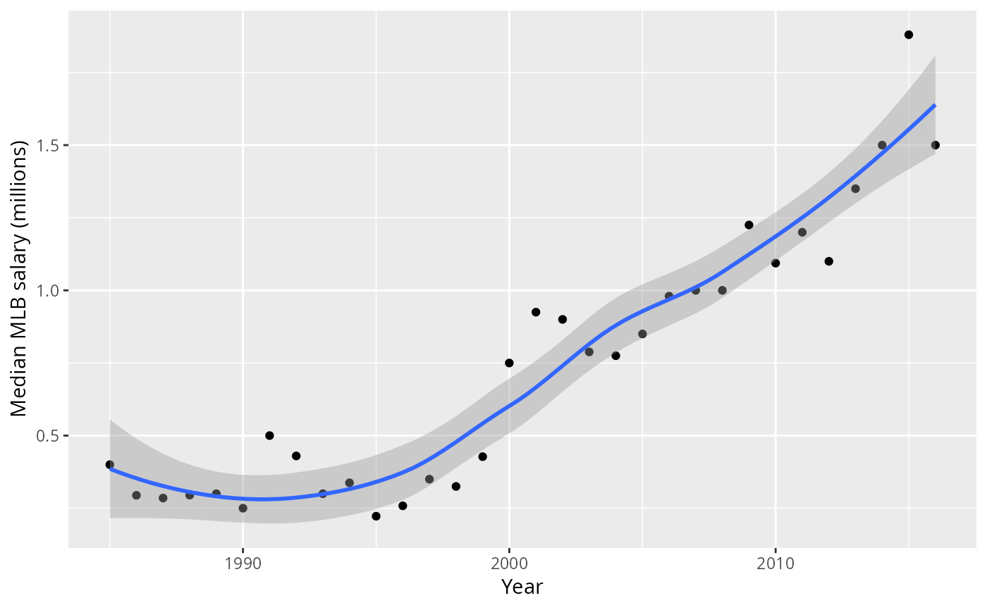 labs(x = "Year", y = "Median MLB salary (millions)")