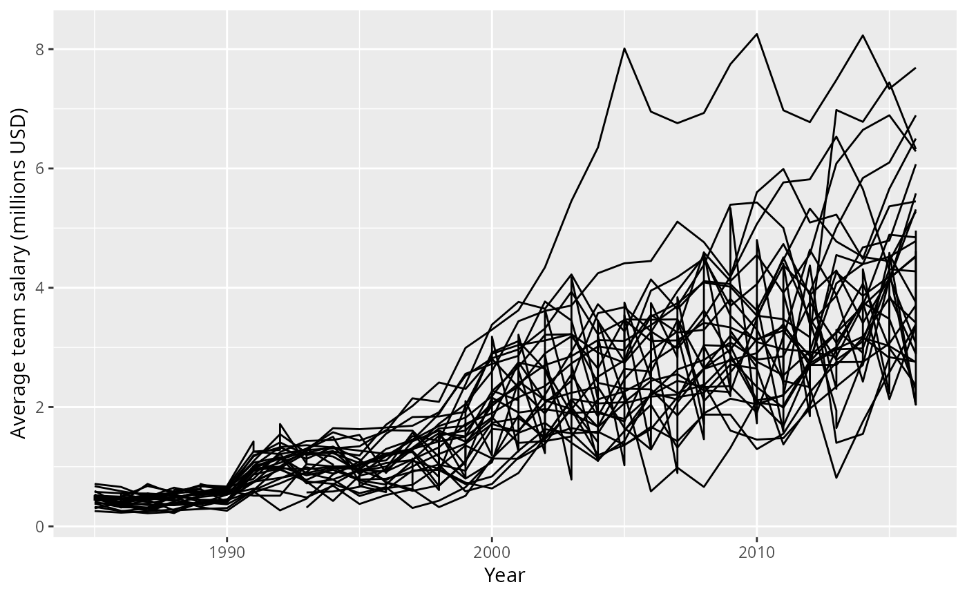 labs(x = "Year", y = "Average team salary (millions USD)")