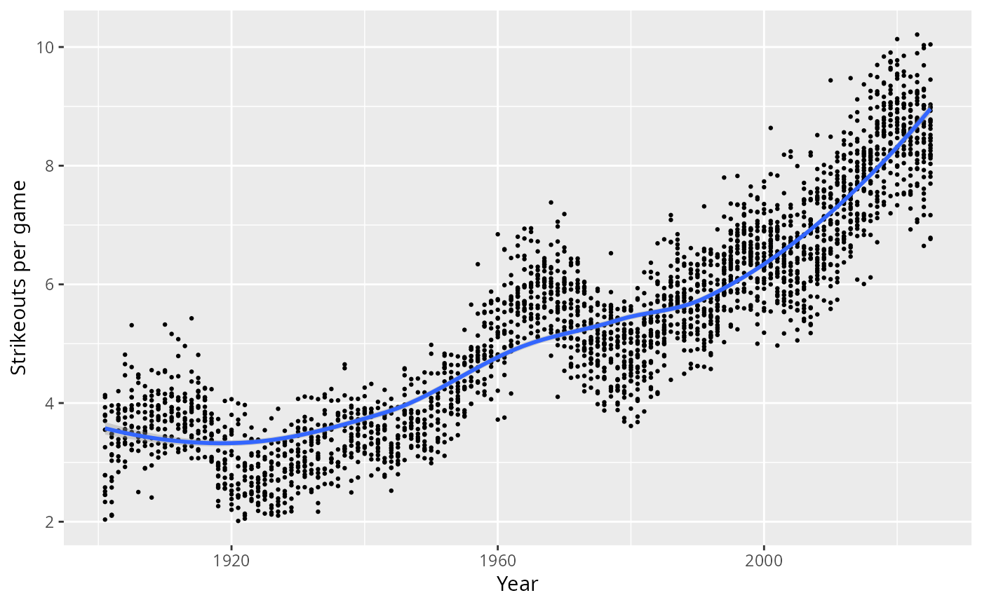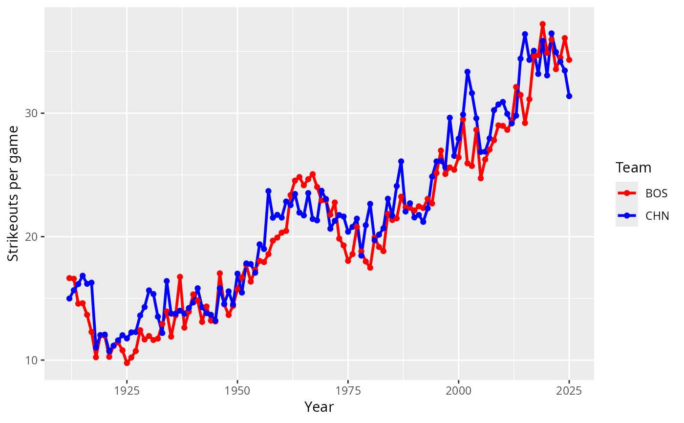 labs(x = "Year", y = "Strikeouts per game", color = "Team") +