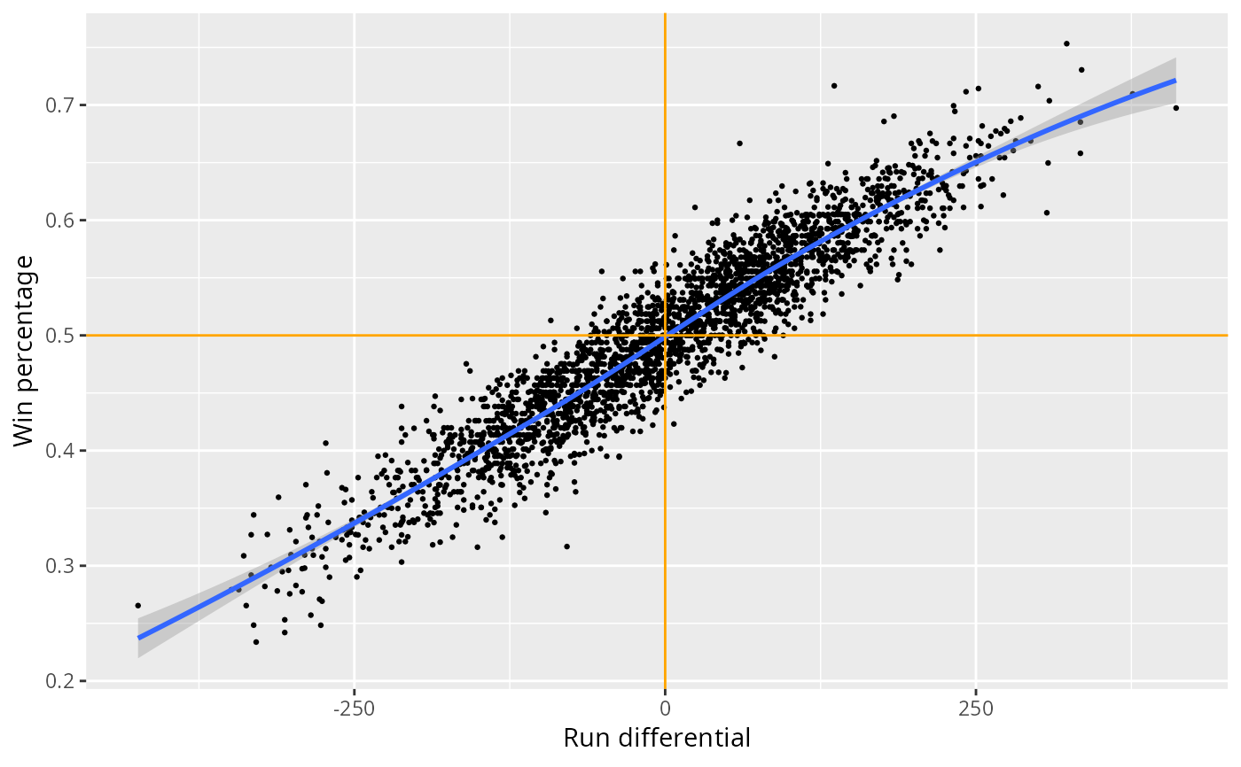 ggplot(teams, aes(x = R - RA, y = WinPct)) +