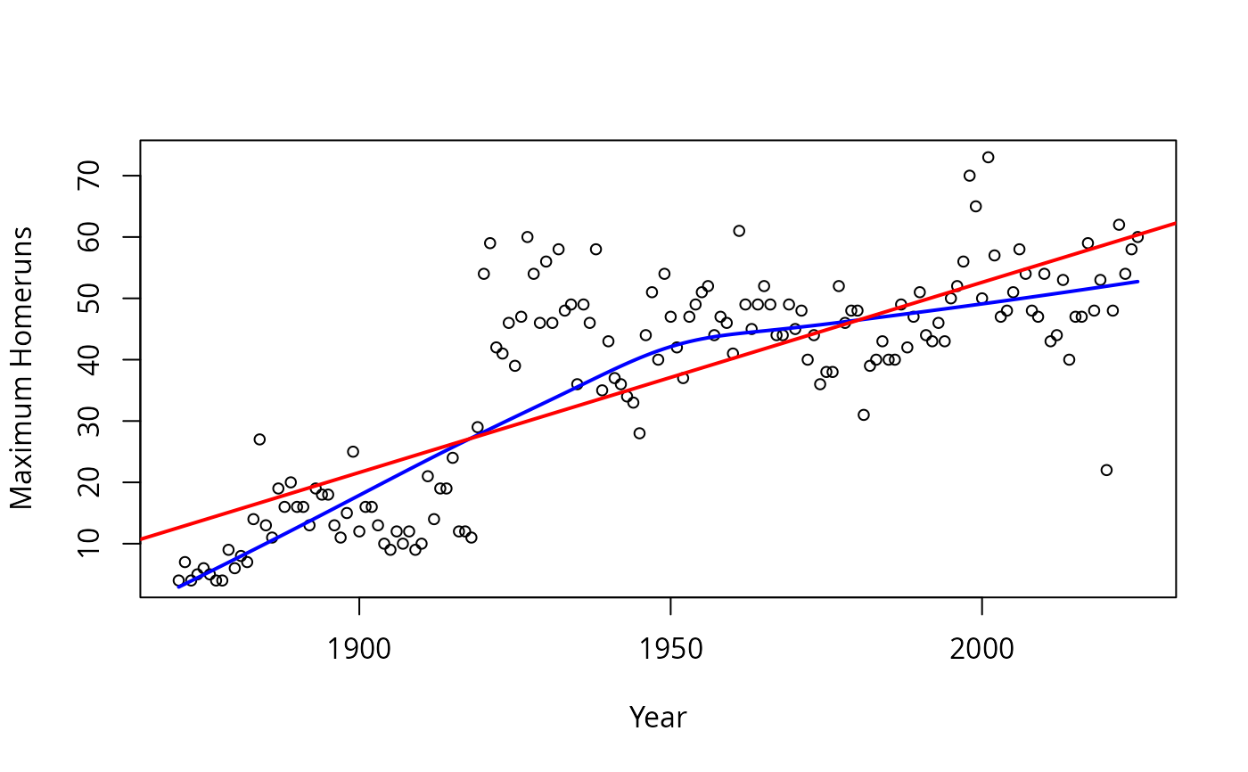 lines(lowess(yearID, max), col="blue", lwd=2)