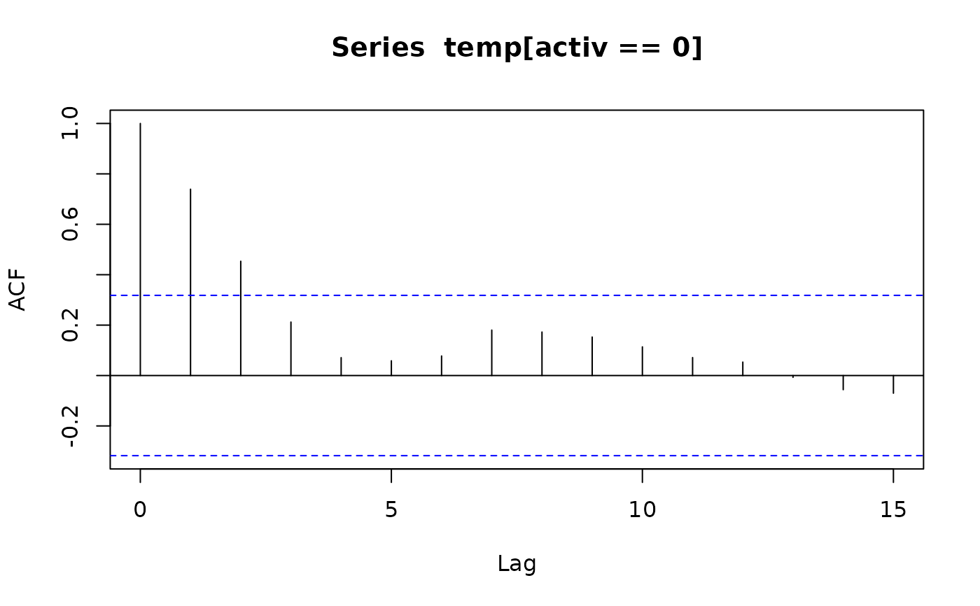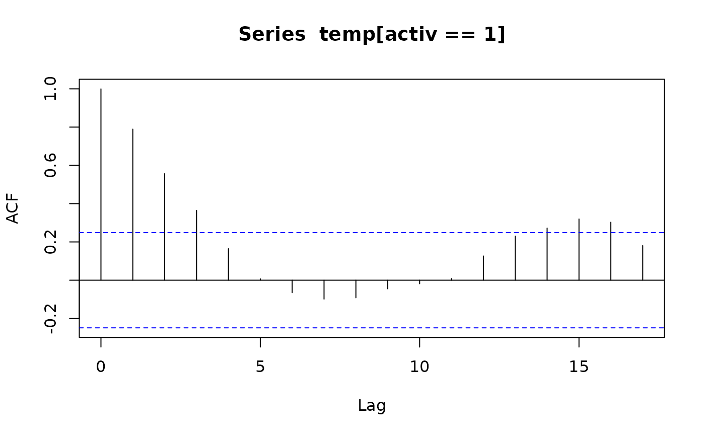 acf(temp[activ == 0]); acf(temp[activ == 1]) # also look at PACFs