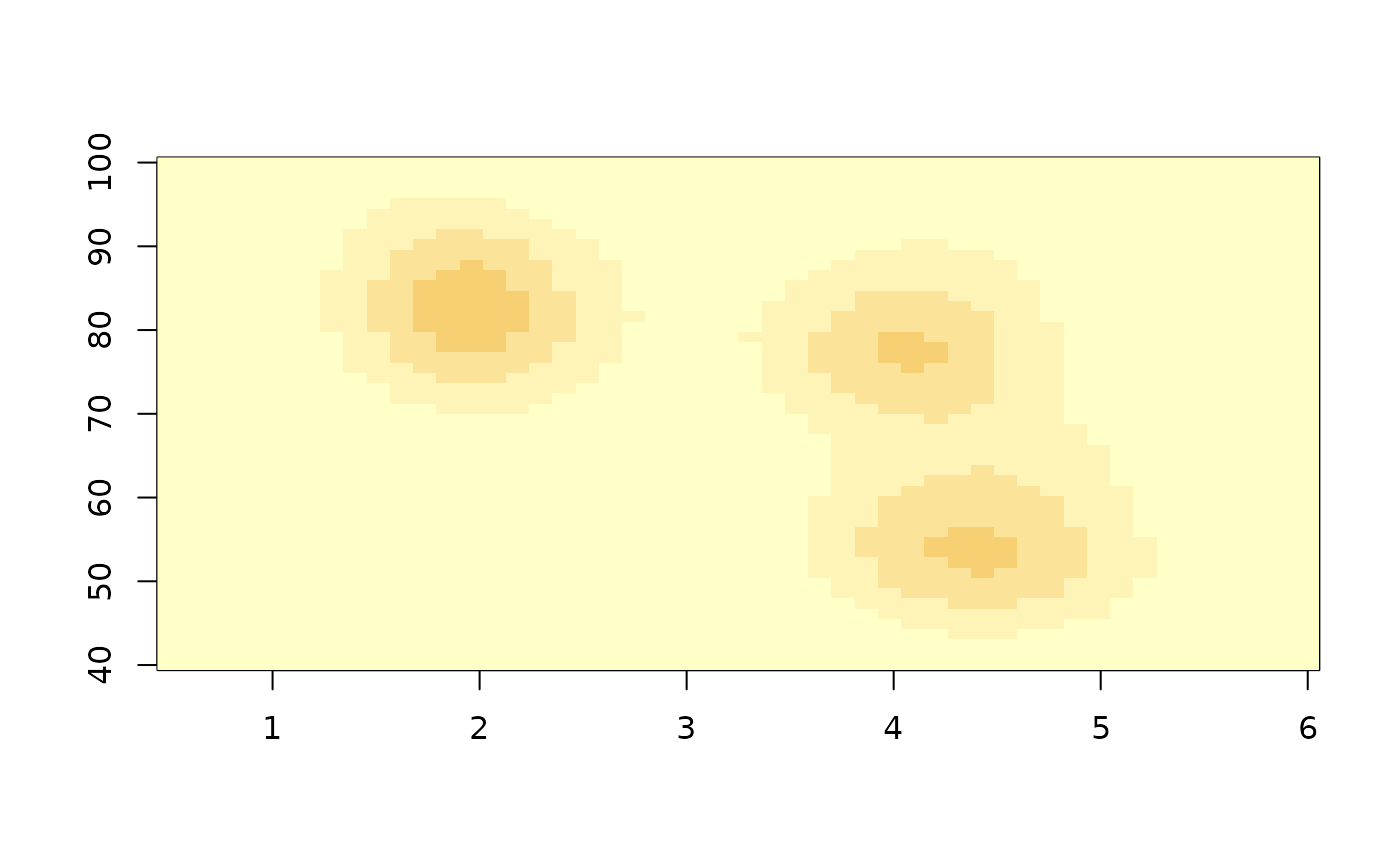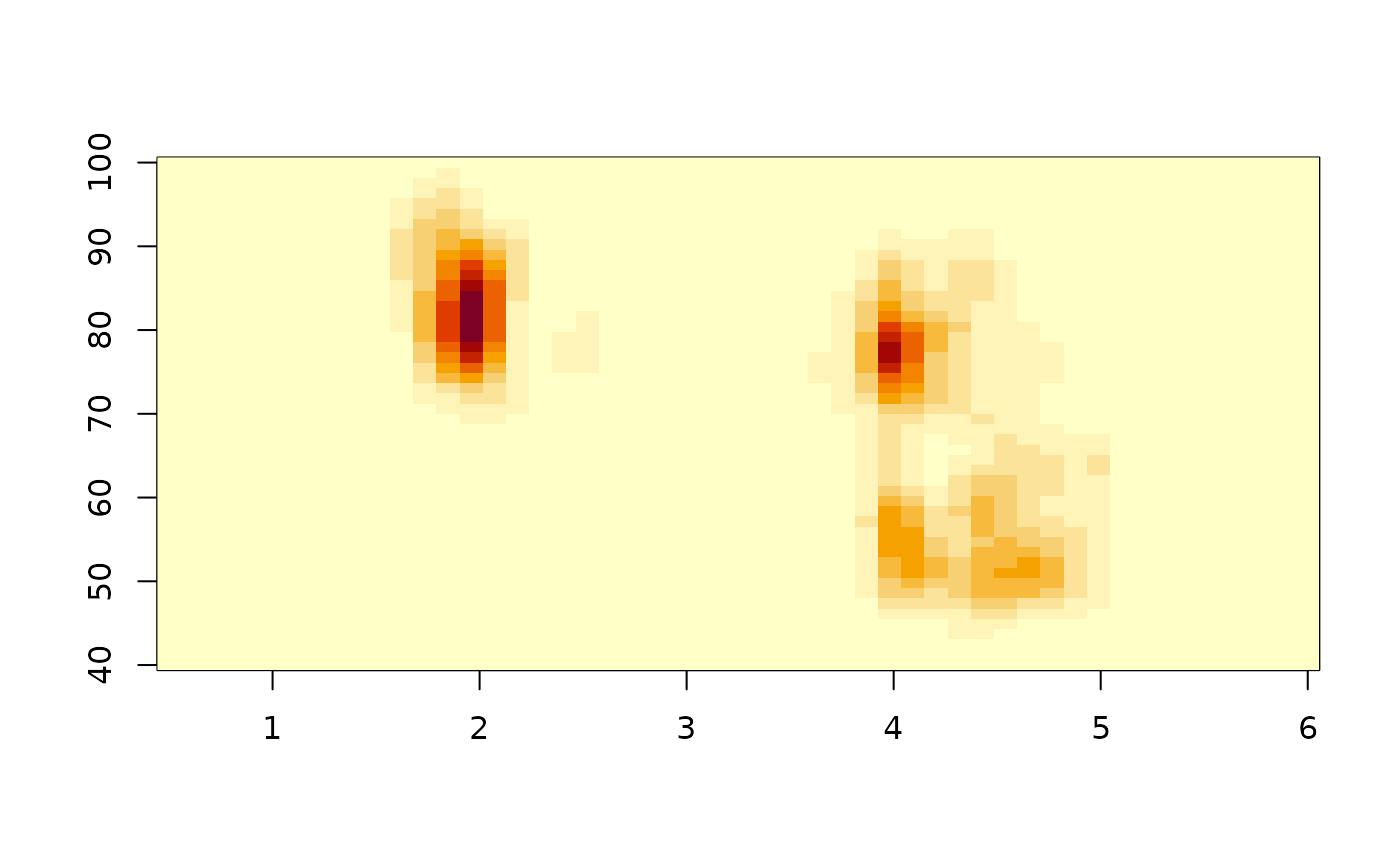 f2 <- kde2d(duration, waiting, n = 50, lims = c(0.5, 6, 40, 100),