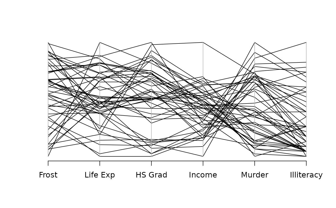 parcoord(x, col = 1, lty = 1, var.label = FALSE, ...)a matrix or data frame who columns represent variables. Missing values are allowed.