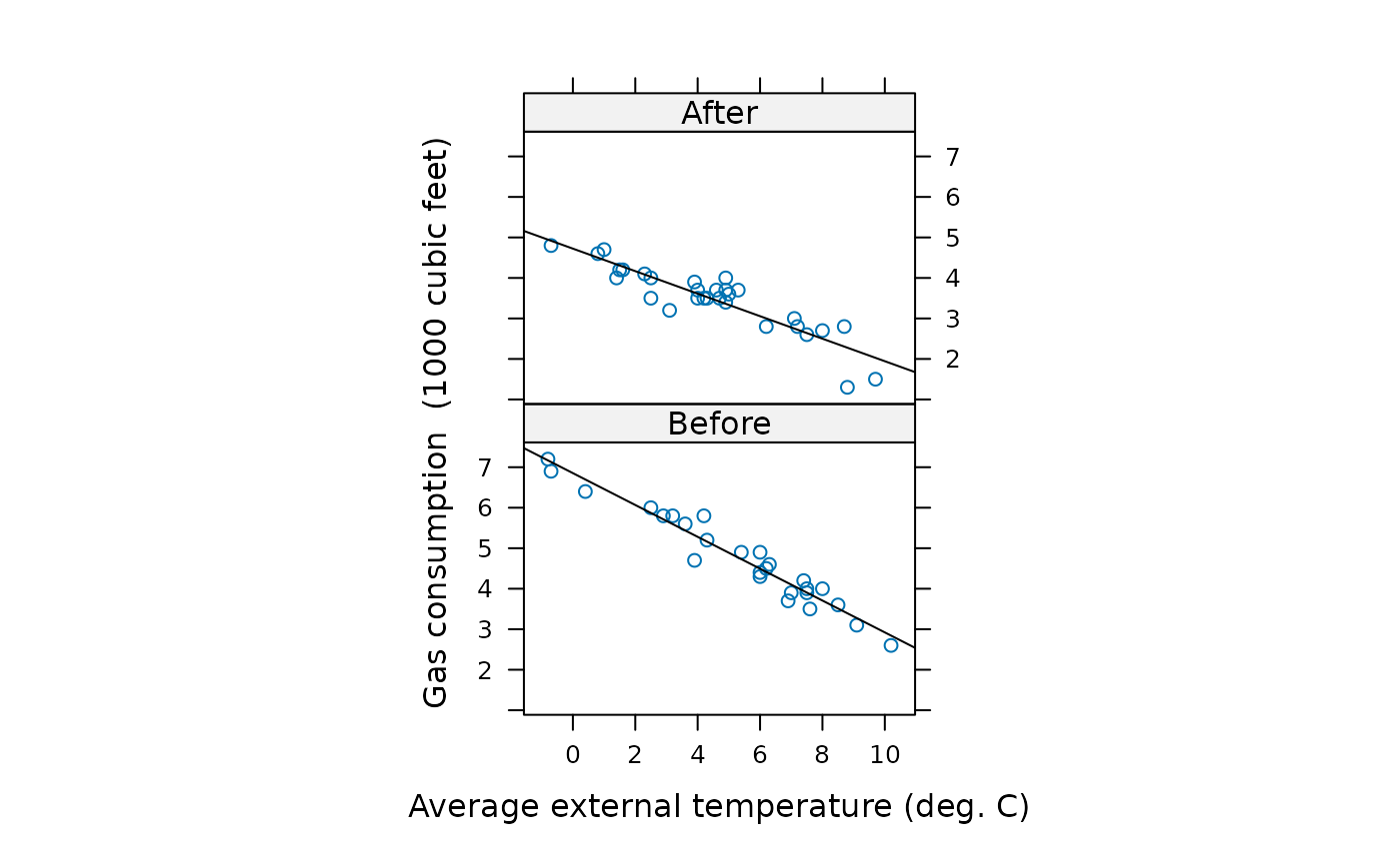 #> lm(formula = Gas ~ Temp, data = whiteside, subset = Insul ==