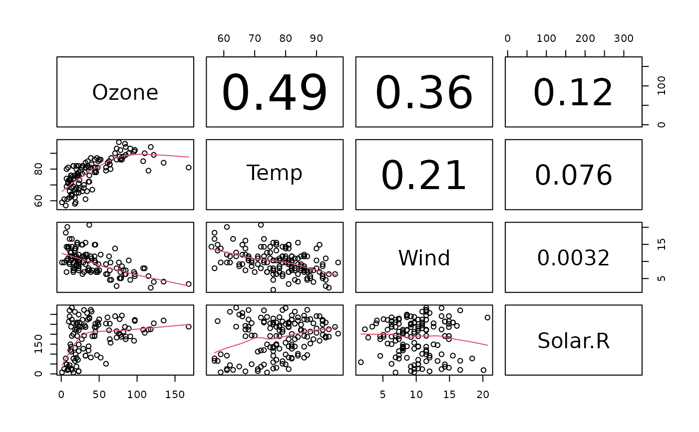pairs(~ Ozone + Temp + Wind + Solar.R, data=airquality,