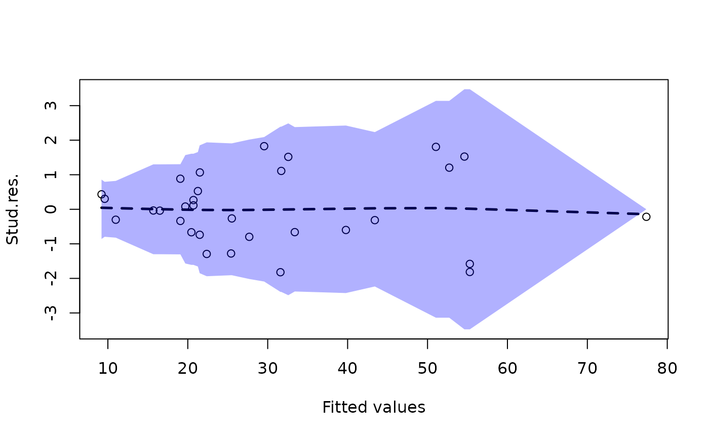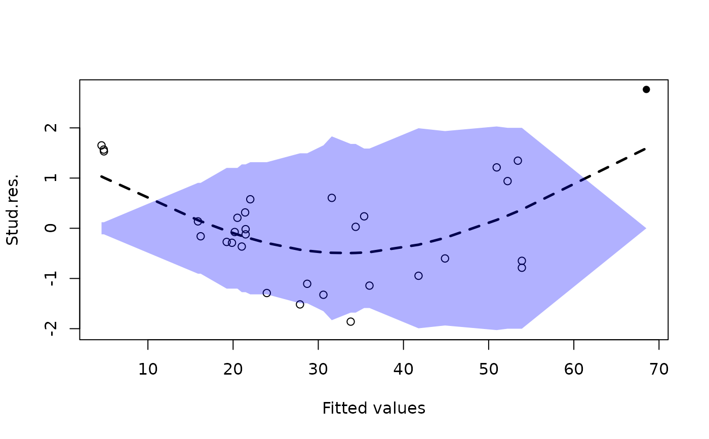 The dashed line shows the smoothed mean of the standardized residuals and should generally follow the horizontal line through (0,0).