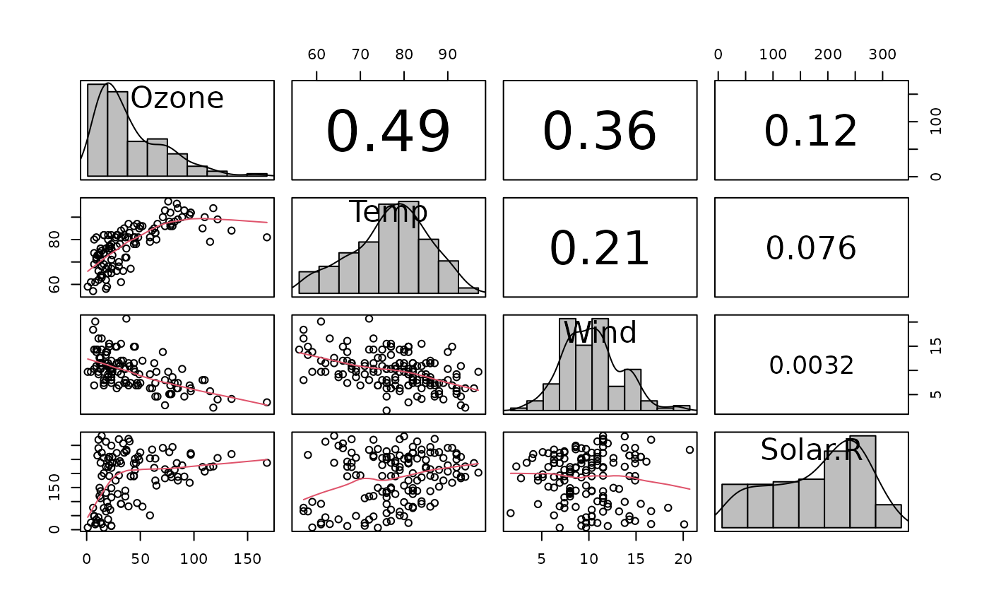 pairs(~ Ozone + Temp + Wind + Solar.R, data=airquality,