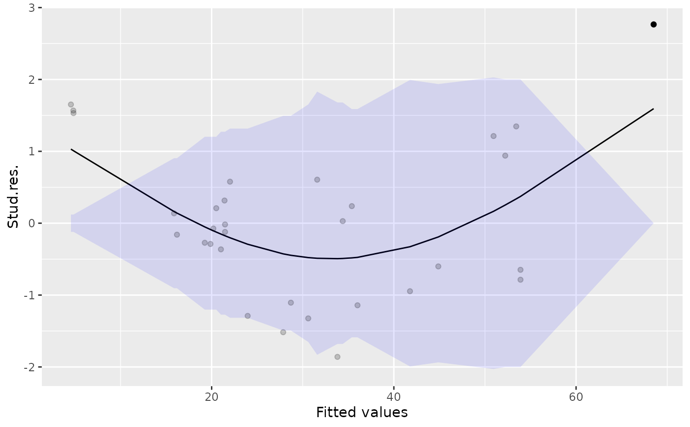 The dashed line shows the smoothed mean of the standardized residuals and should generally follow the horizontal line through (0,0).