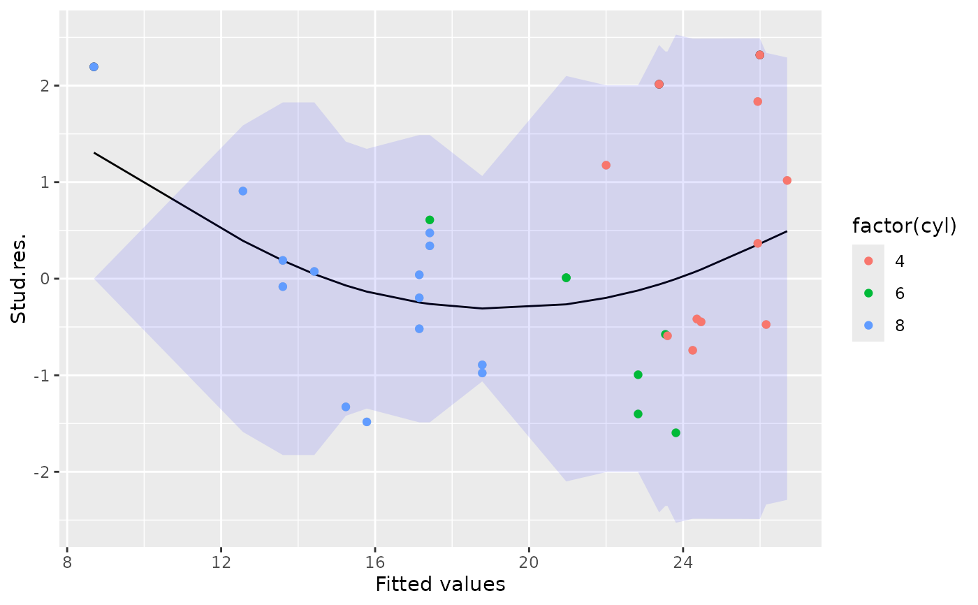 residual_plot(m) + ggplot2::geom_point(ggplot2::aes(color=factor(cyl)), data=mtcars)