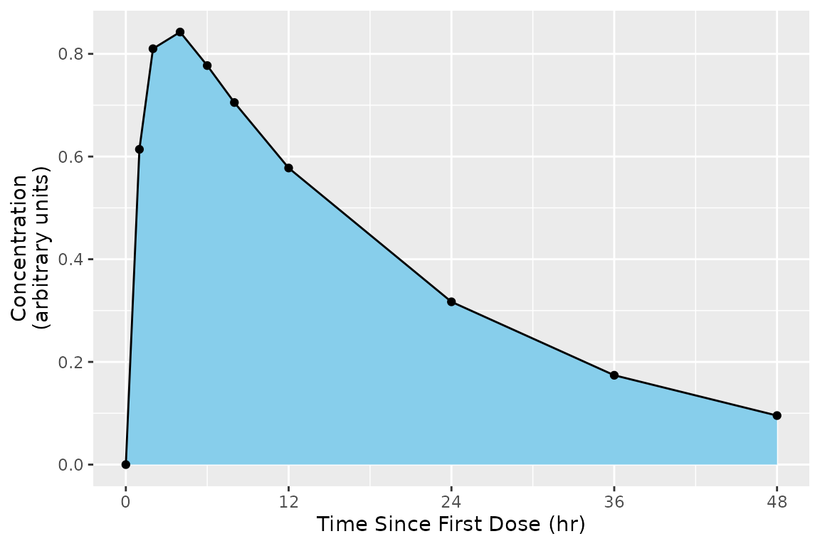 PKNCAdata(d_conc, intervals=intervals_manual)## Formula for concentration: