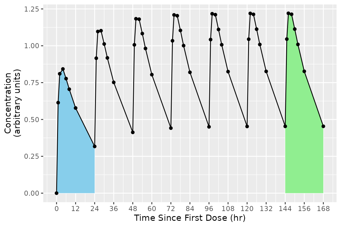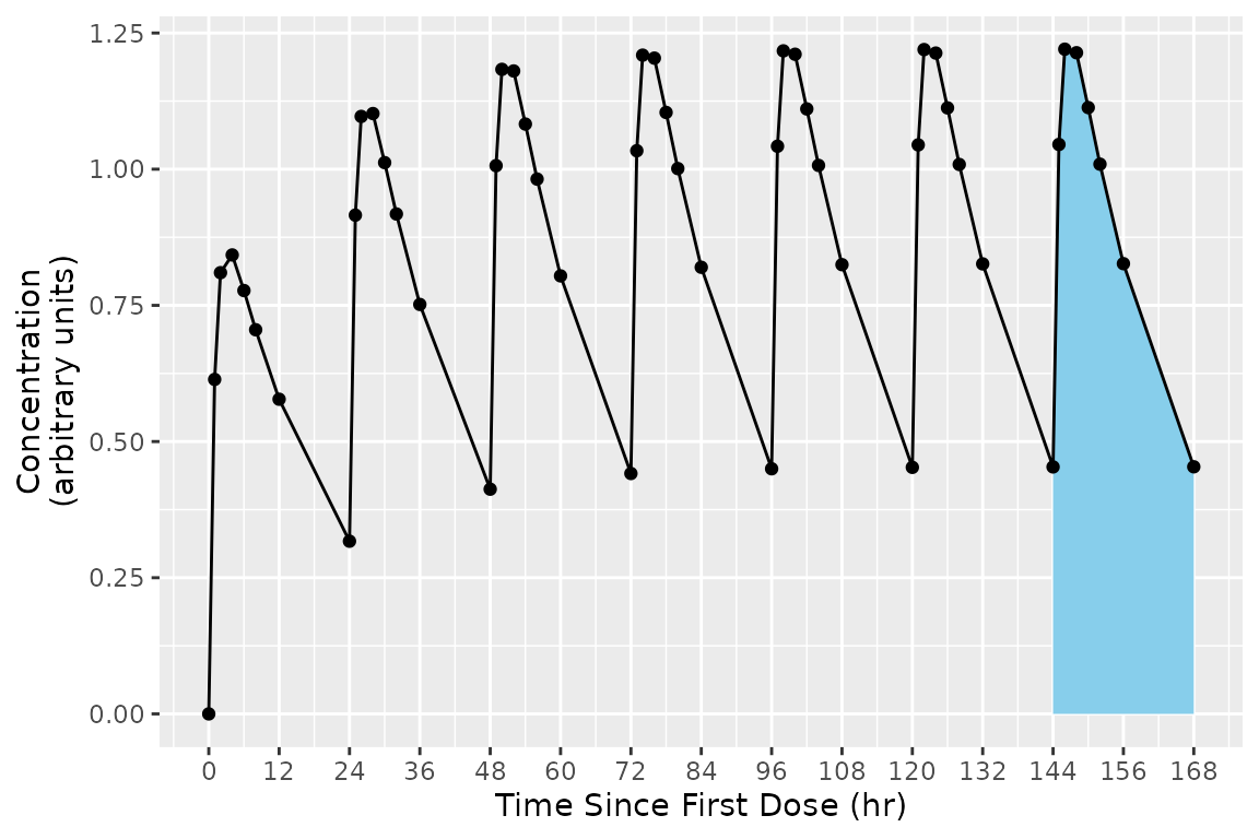 As a concrete example, consider the figure below shows the concentration-time profile of a study subject in a multiple-dose study. The group is all points in the figure, and the interval for the last day (144 to 168 hr) is the area with blue shading.