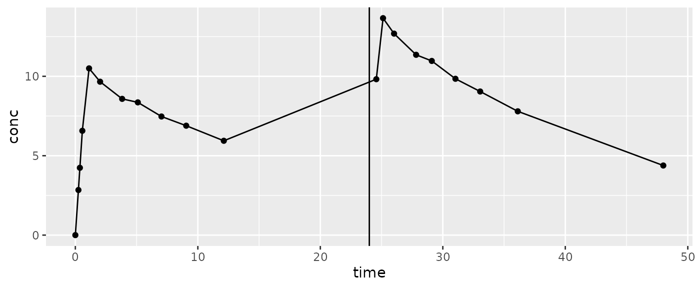 o_data <- PKNCAdata(o_conc, intervals=d_intervals)