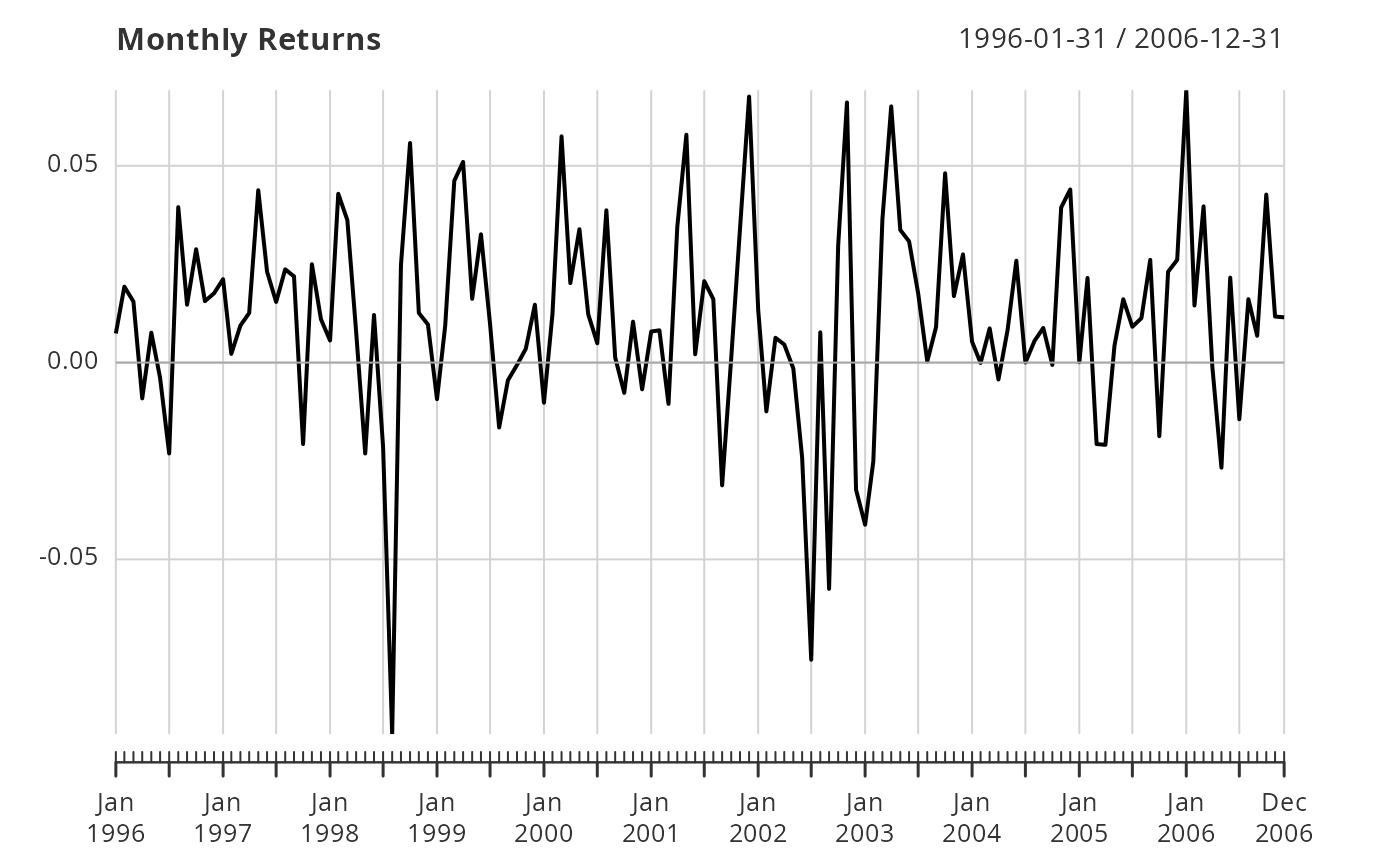 chart.BarVaR(managers[,1,drop=FALSE], main="Monthly Returns")
