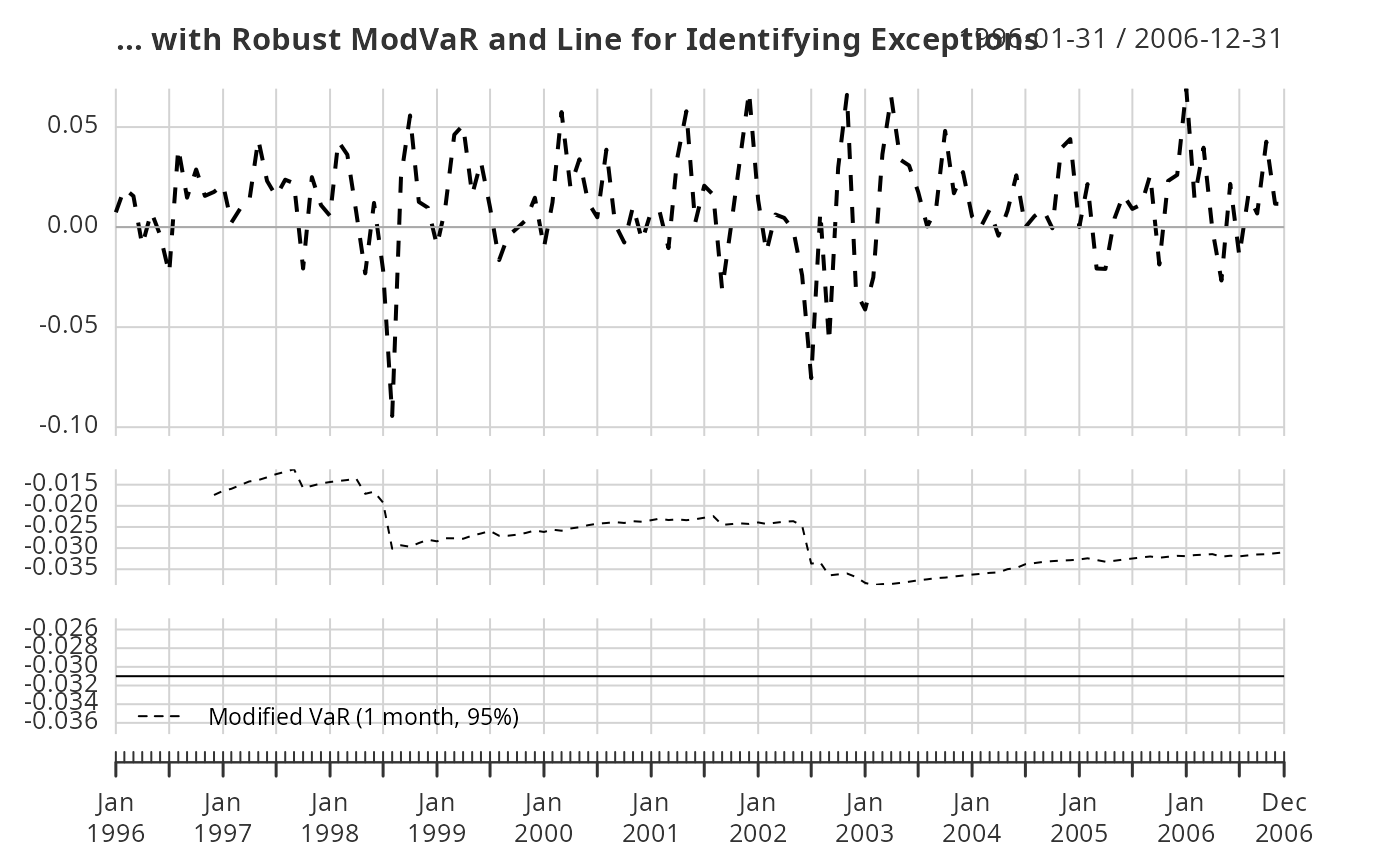 main="... with Robust ModVaR and Line for Identifying Exceptions")