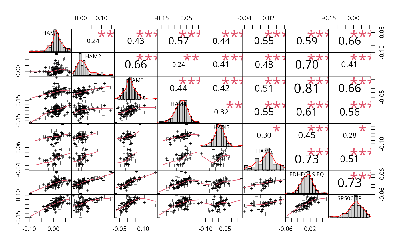 chart.Correlation(managers[,1:8], histogram=TRUE, pch="+")