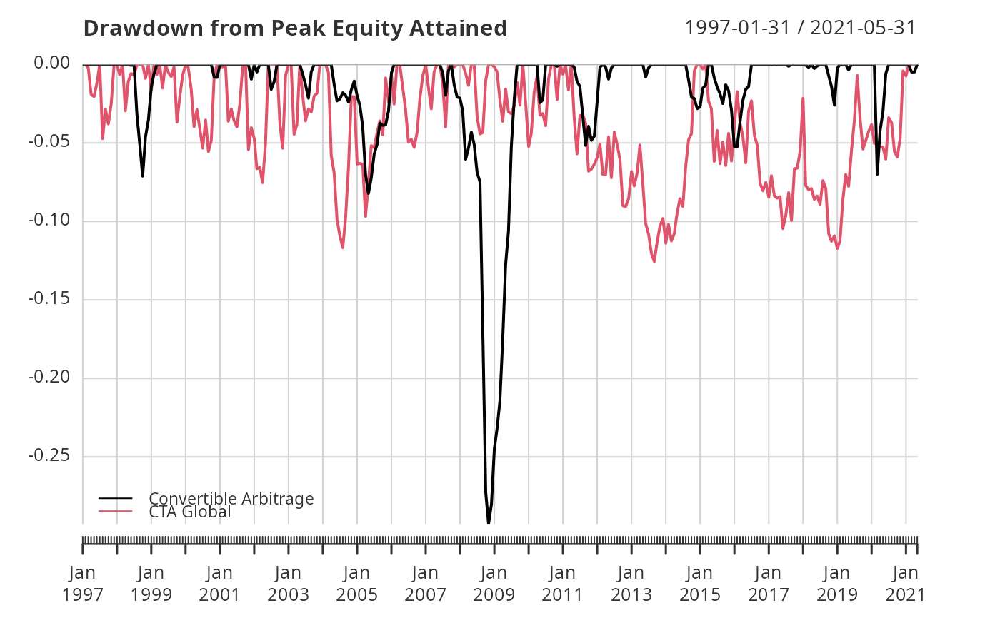 A time series chart demonstrating drawdowns from peak equity attained through time, calculated from periodic returns.