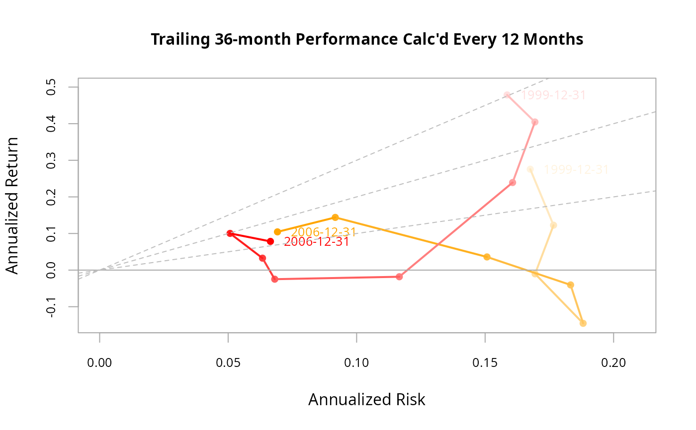 A chart that shows rolling calculations of annualized return and annualized standard deviation have proceeded through time. Lines and dots are darker for more recent time periods.