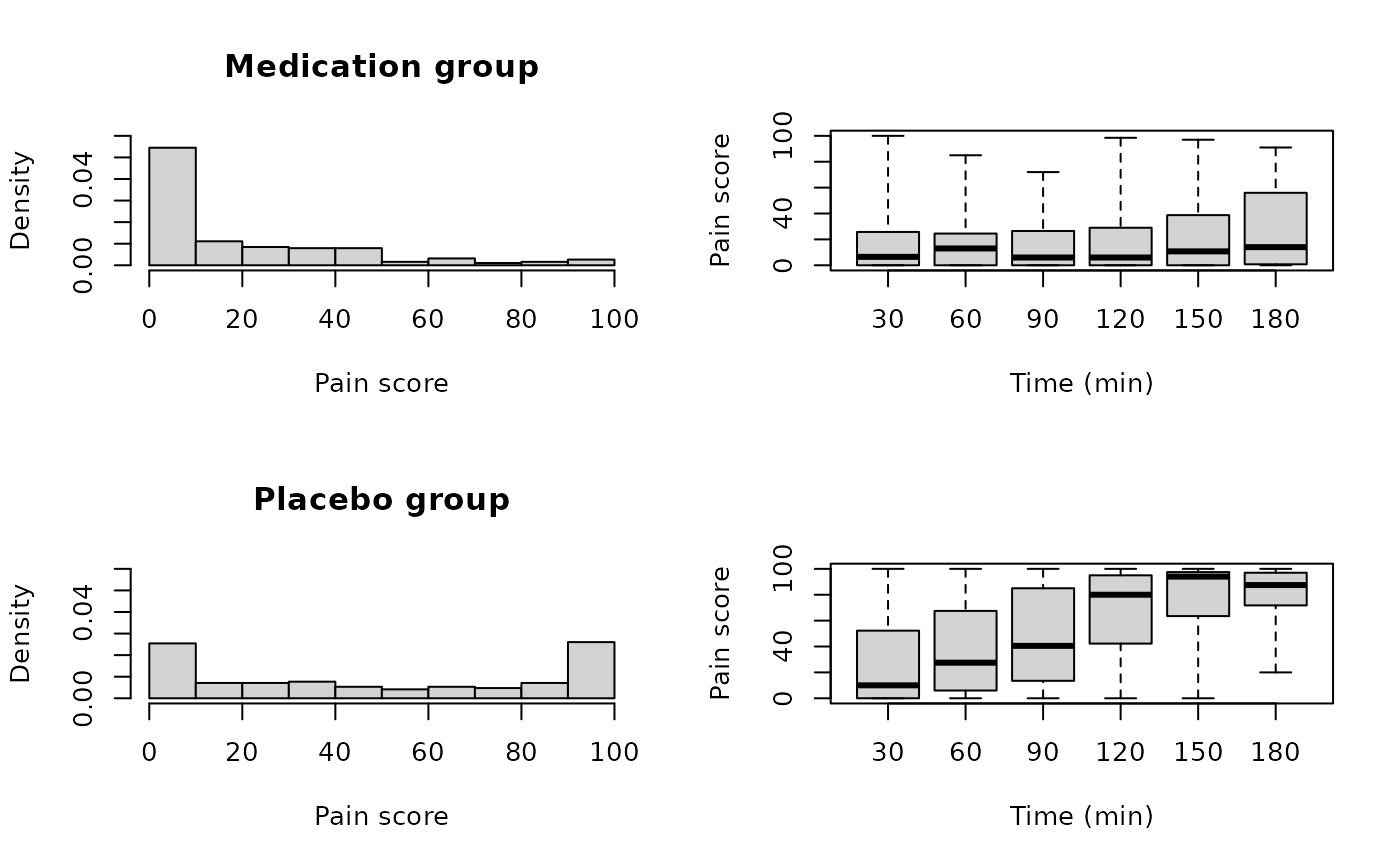 hist(new$y[new$treatment == 1], xlab = "Pain score", main = "Medication group",