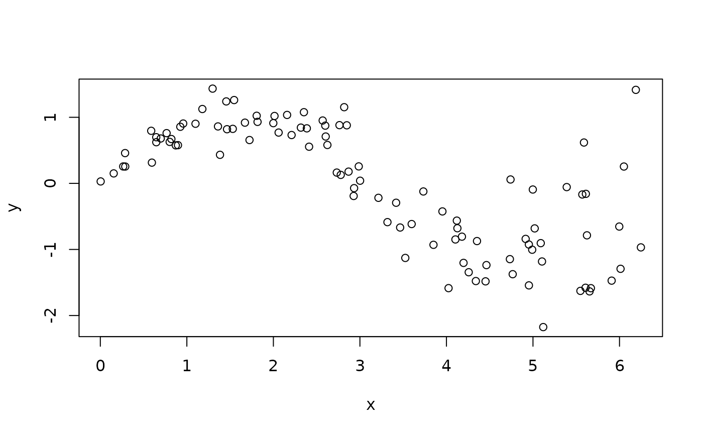 y <- sin(x) + (1 + x)*rnorm(n, 0, 0.1)