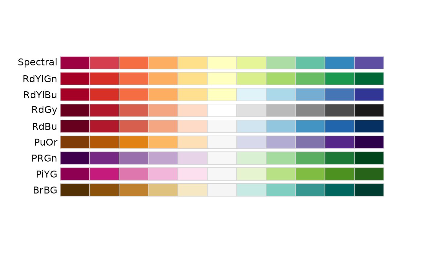 All the diverging palettes are available in variations from 3 different values up to 11 different values.
