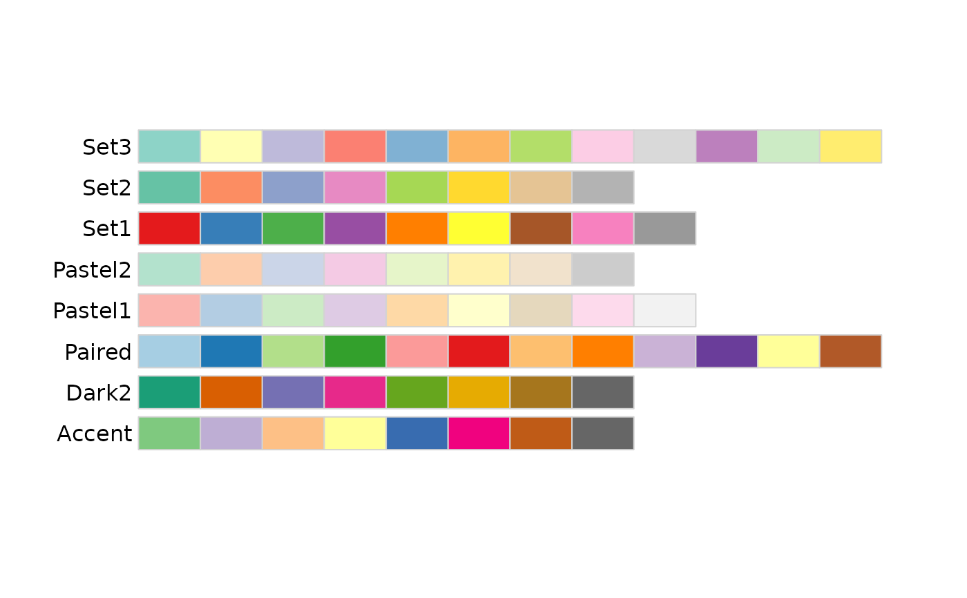 For qualitative palettes, the lowest number of distinct values available always is 3, but the largest number is different for different palettes. It is given together with the palette names in the following table.