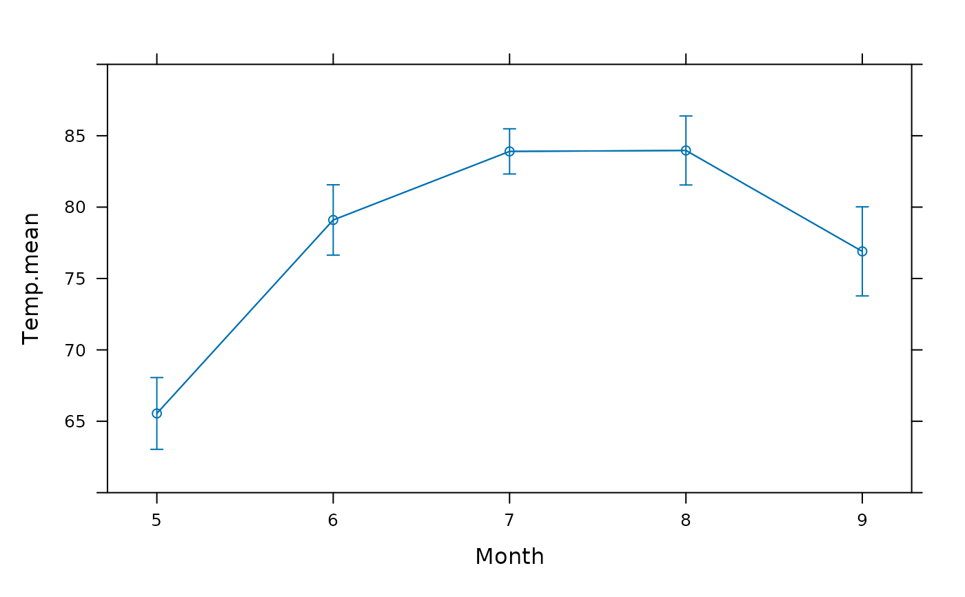 xYplot(Cbind(Temp.mean,Temp.lower,Temp.upper)~numericScale(Month),type="b",ylim=c(60,90))