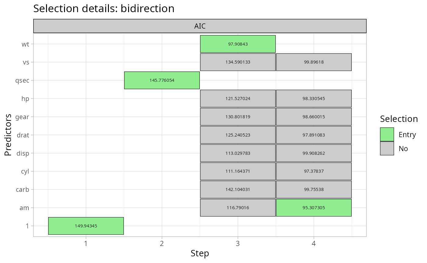 The following example selects an optimal linear regression model with the mtcars dataset.