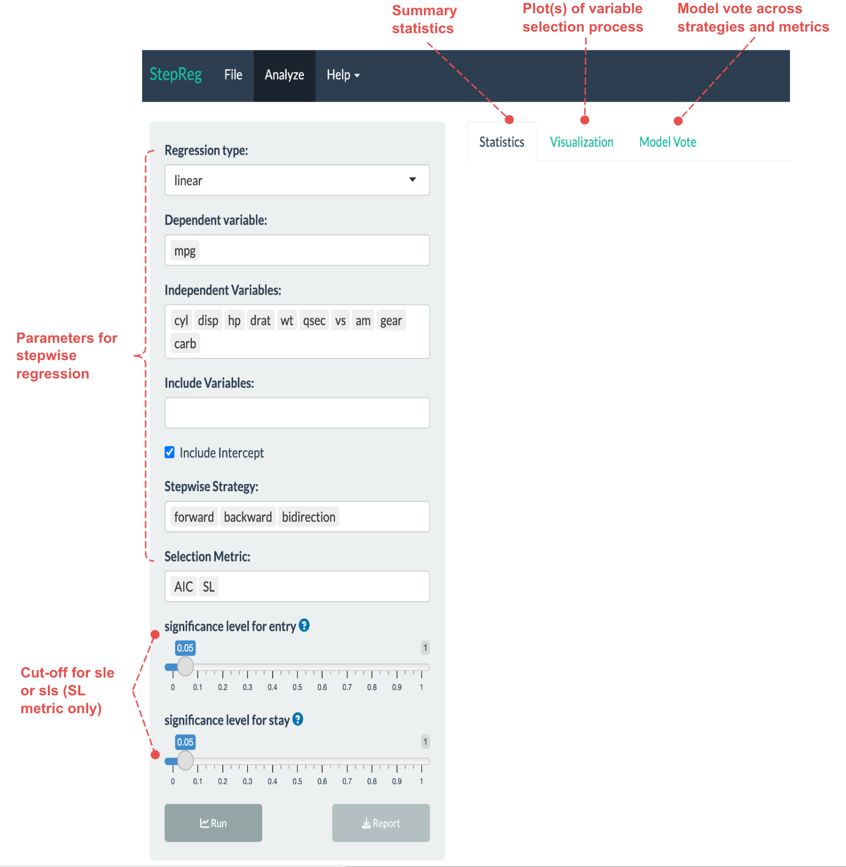 StepReg simplifies model selection tasks by providing a unified programming interface. It currently supports model buildings for five distinct response variable types (section @ref(regressioncategories)), four model selection strategies (section @ref(modelselectionstrategies)) including the best subsets algorithm, and a variety of selection metrics (section @ref(selectionmetrics)). Moreover, StepReg detects and addresses the multicollinearity issues if they exist (section @ref(multicollinearity)). The output of StepReg includes multiple tables summarizing the final model and the variable selection procedures. Additionally, StepReg offers a plot function to visualize the selection steps (section @ref(stepregoutput)). For demonstration, the vignettes include four use cases covering distinct regression scenarios (section @ref(usecases)). Non-programmers can access the tool through the iterative Shiny app detailed in section @ref(shinyapp).