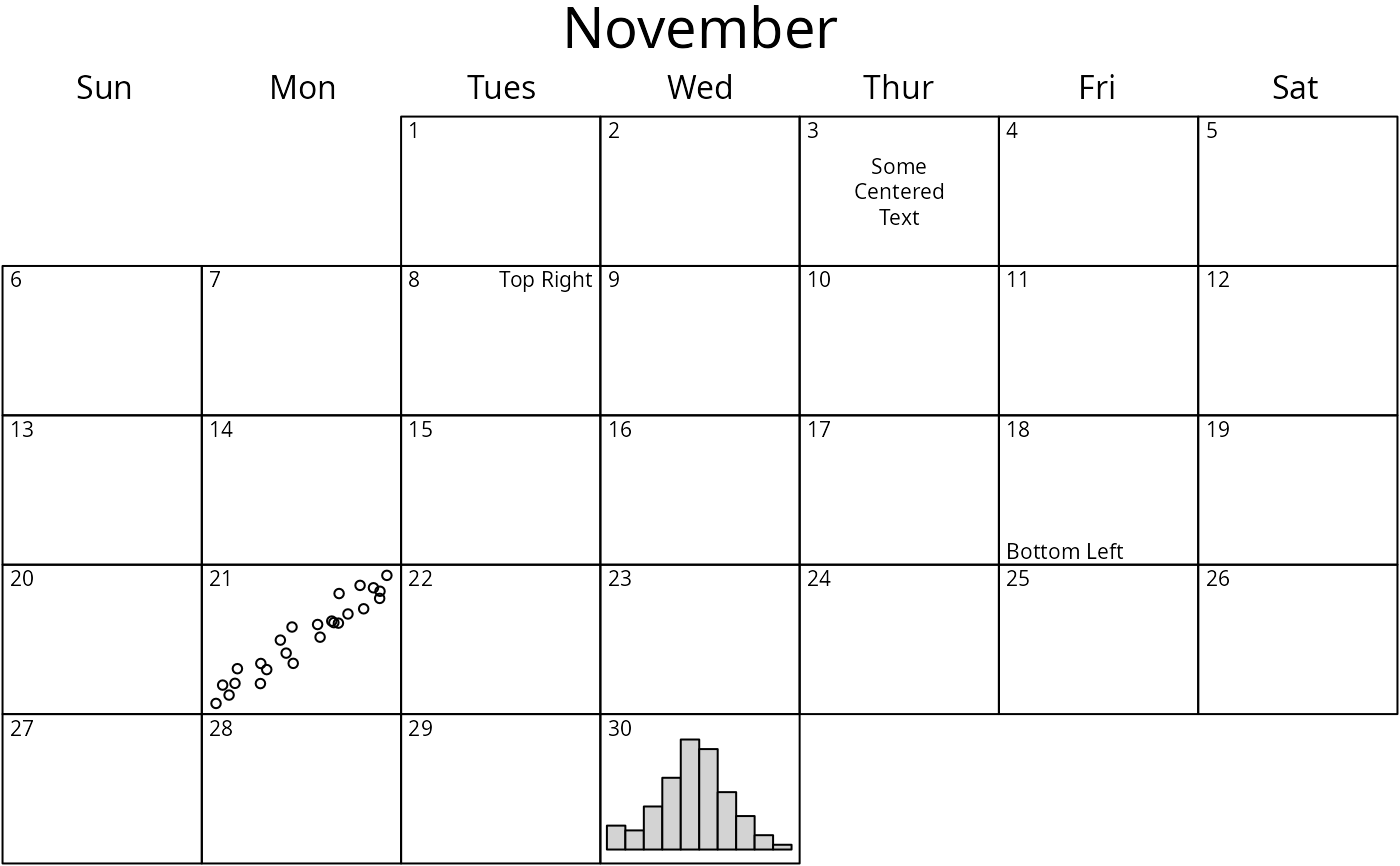 cal.RdPlot a calendar of the specified year or month. Monthly calendars can have additional information (text/plots) added to the individual cells.
