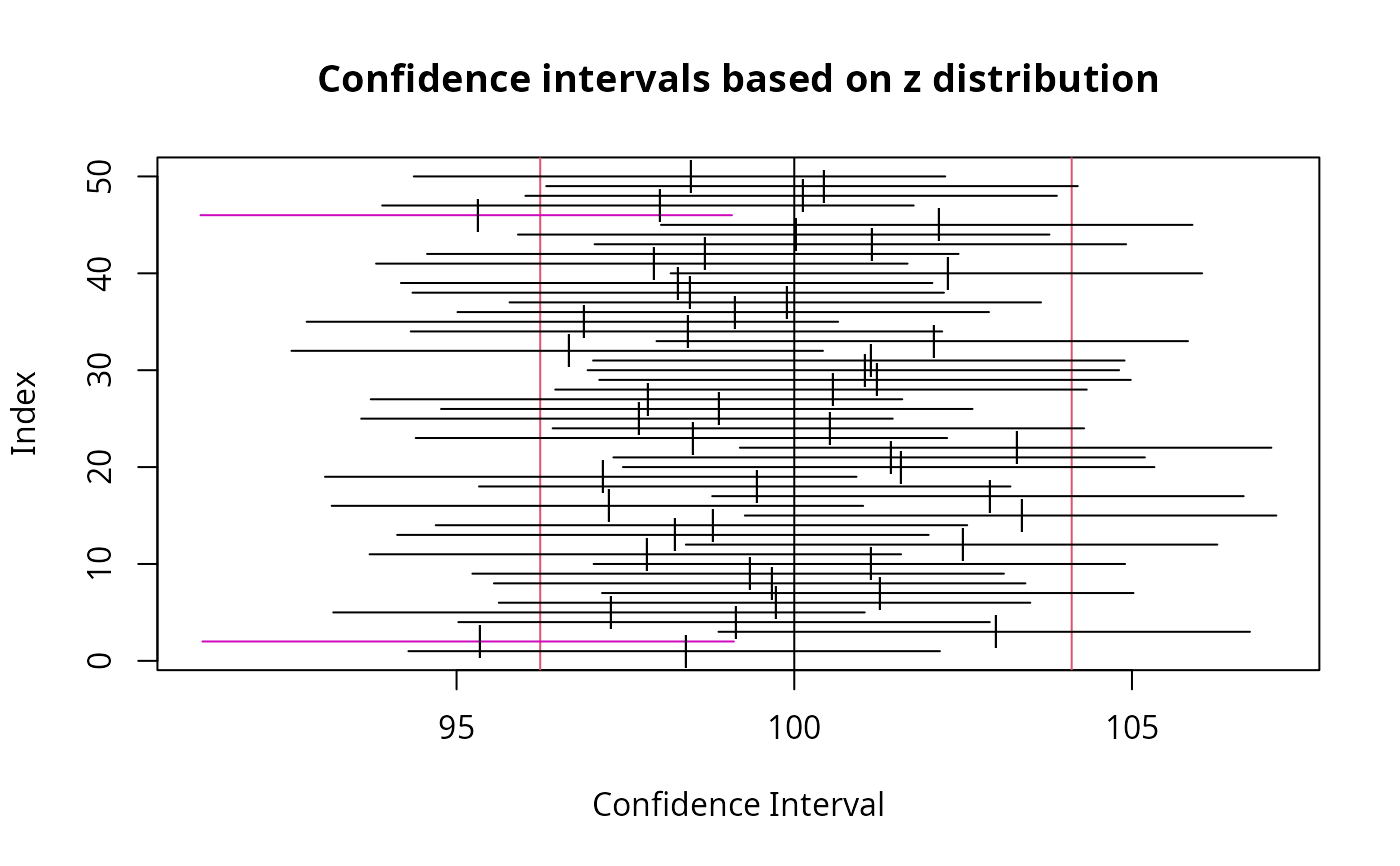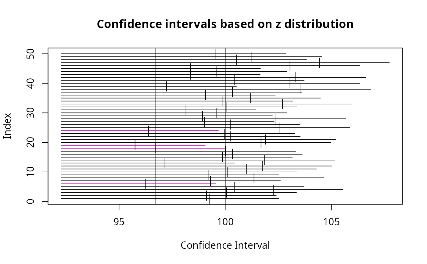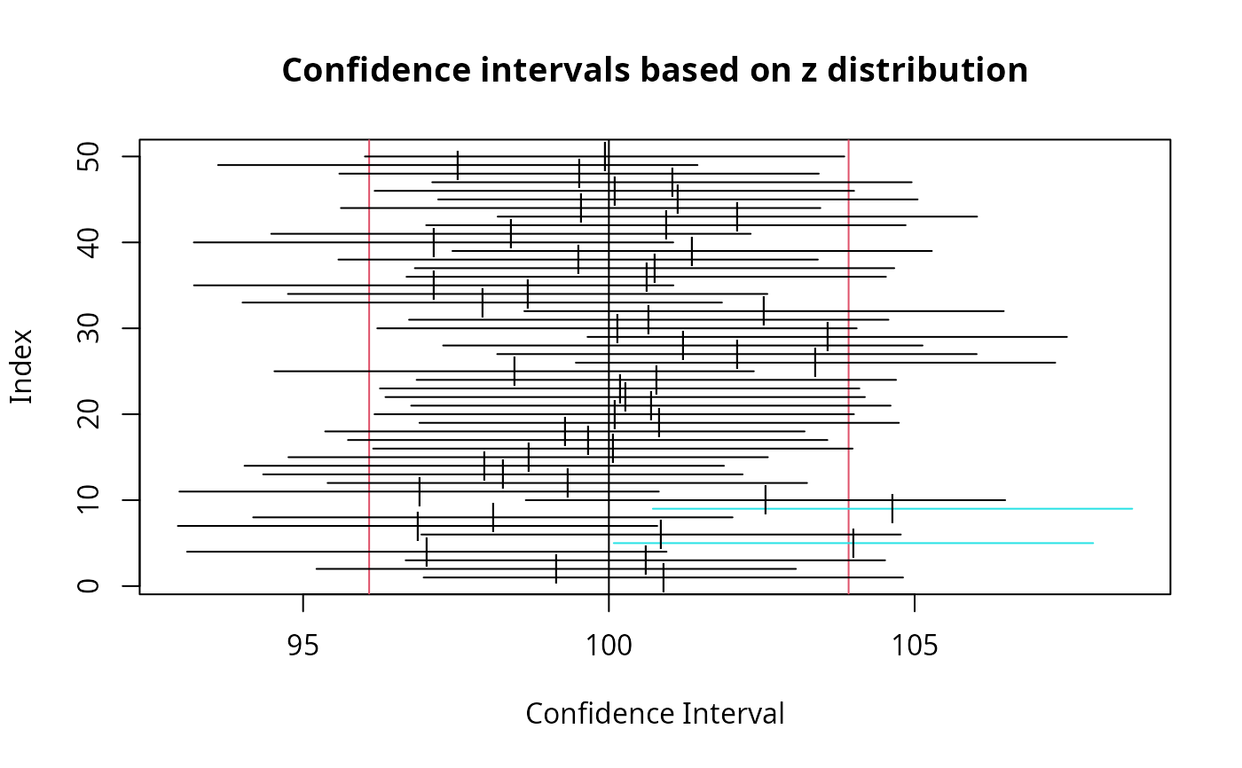 These functions demonstrate the concept of confidence intervals by taking multiple samples from a known normal distribution and calculating a confidence interval for each sample and plotting the interval relative to the true mean. Intervals that contain the true mean will be plotted in black and those that do not include the true mean will be plotted in different colors.
