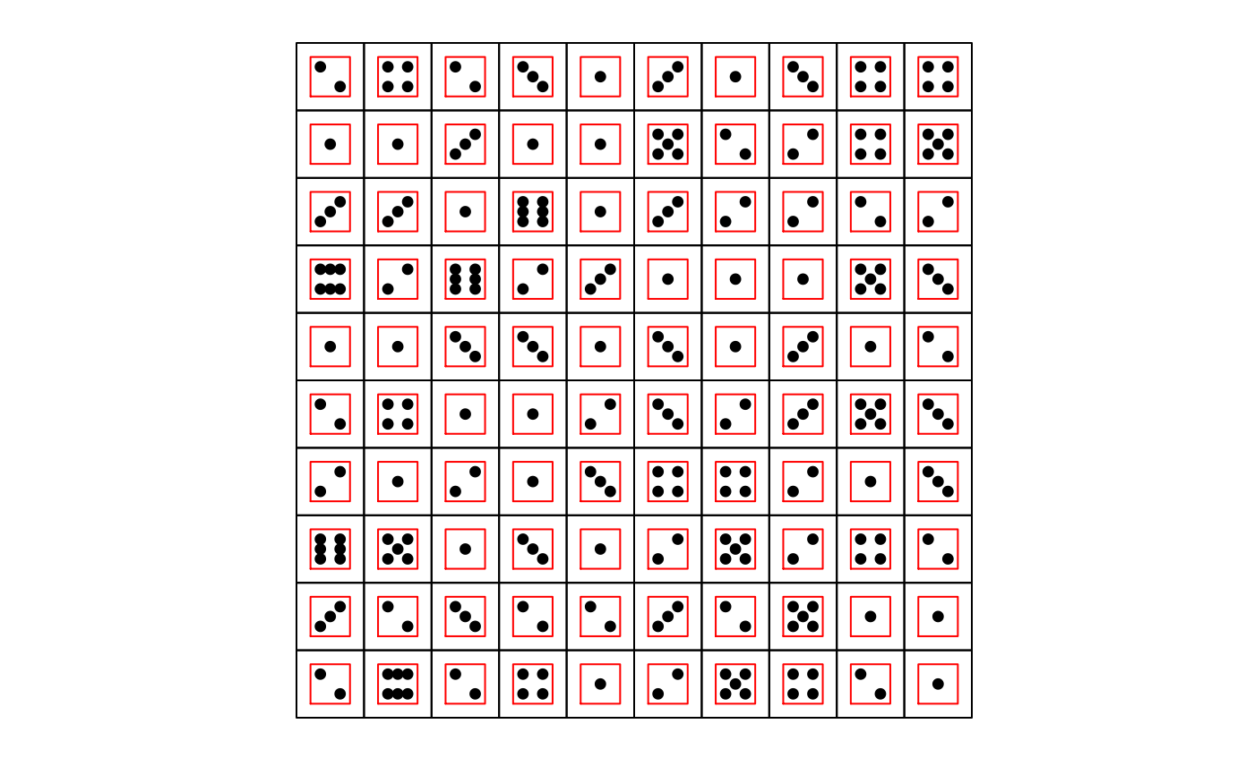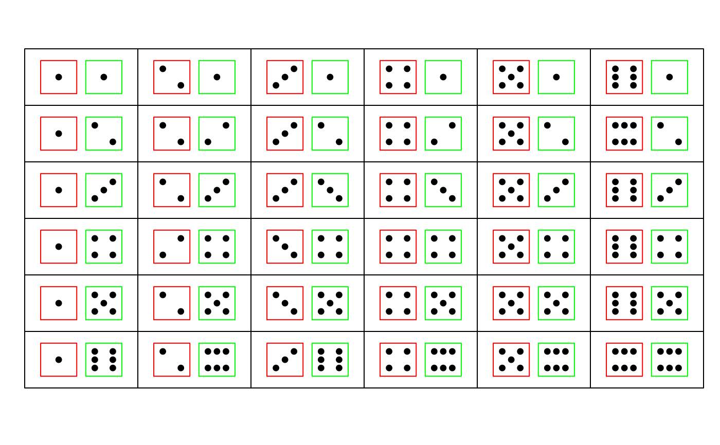 plot.dice( expand.grid(1:6,1:6), layout=c(6,6) )