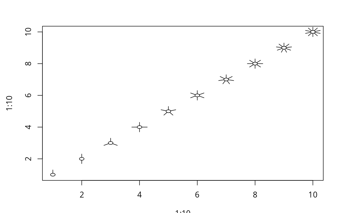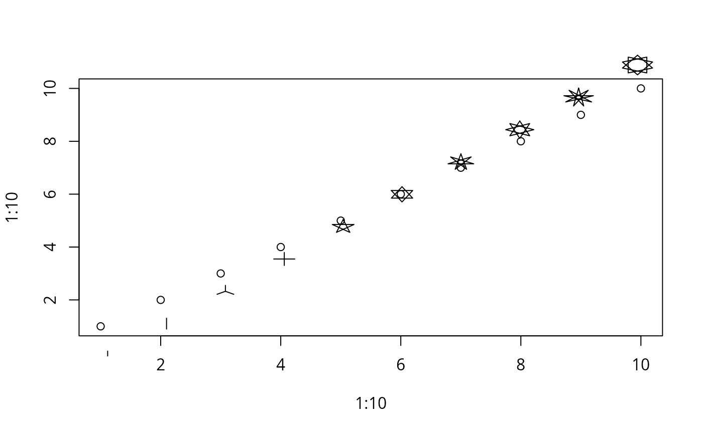 my.symbols(1:10,1:10, ms.polygram, n=1:10, r=seq(0.5,1,length.out=10),