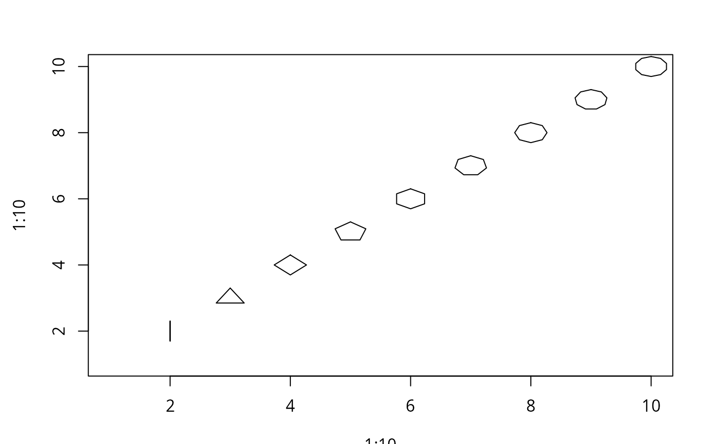 my.symbols(1:10,1:10, ms.polygon, n=1:10, add=FALSE, inches=0.3)
