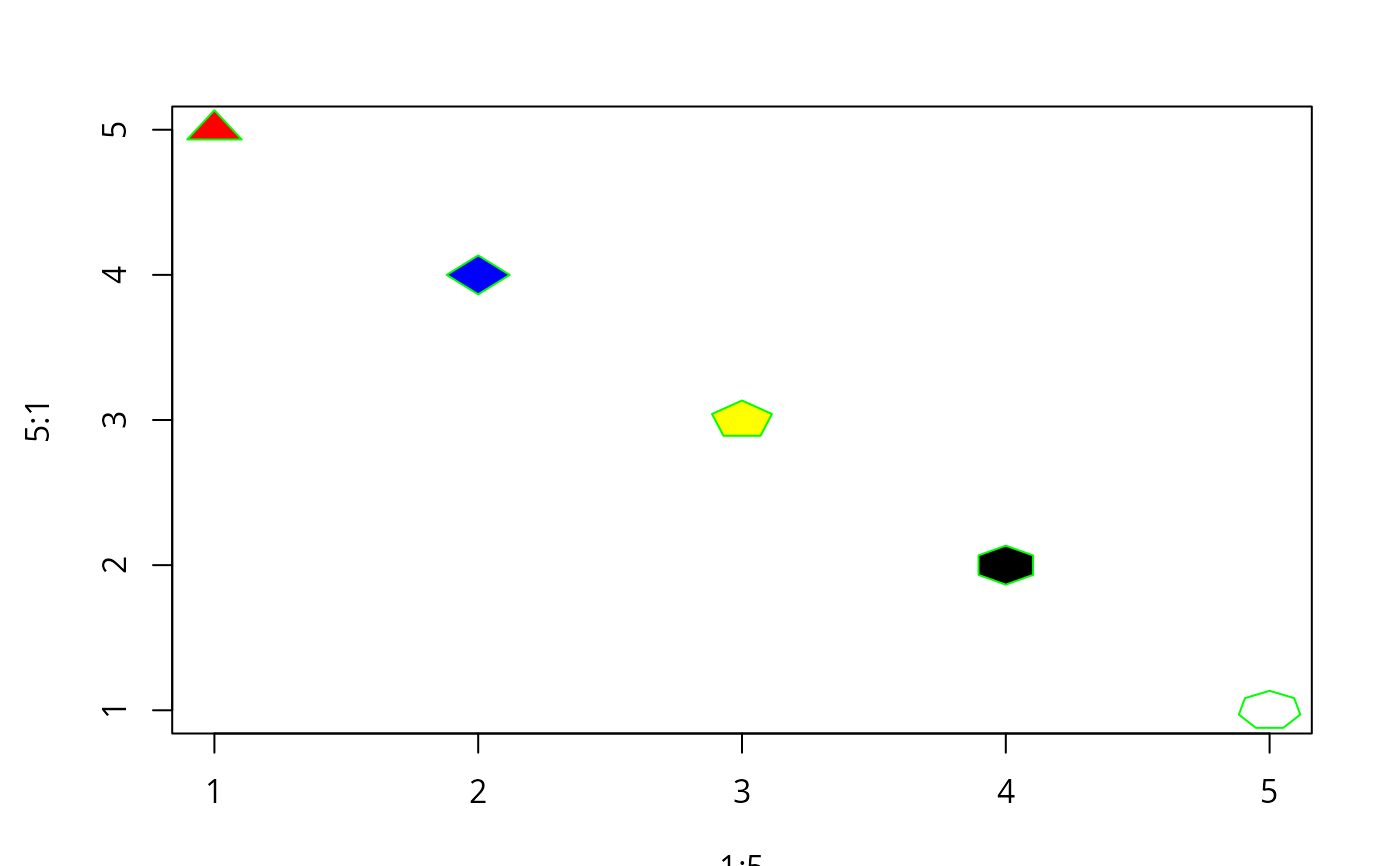 my.symbols(1:5, 5:1, ms.filled.polygon, add=FALSE, n=3:7, fg='green',