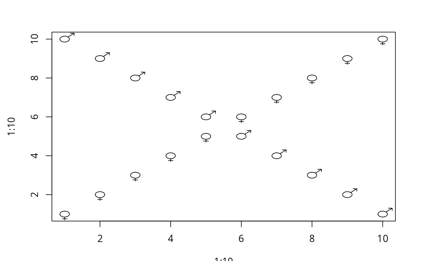 my.symbols( 1:10, 1:10, ms.female, inches=0.3, add=FALSE)