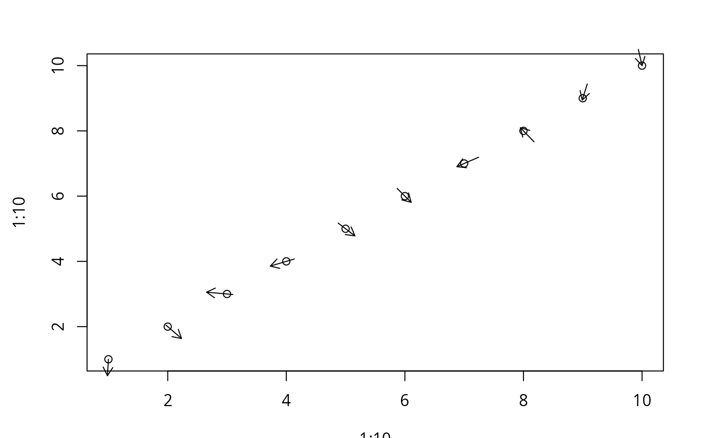 my.symbols(1:10, 1:10, ms.arrows, angle=runif(10)*2*pi, inches=0.5,
