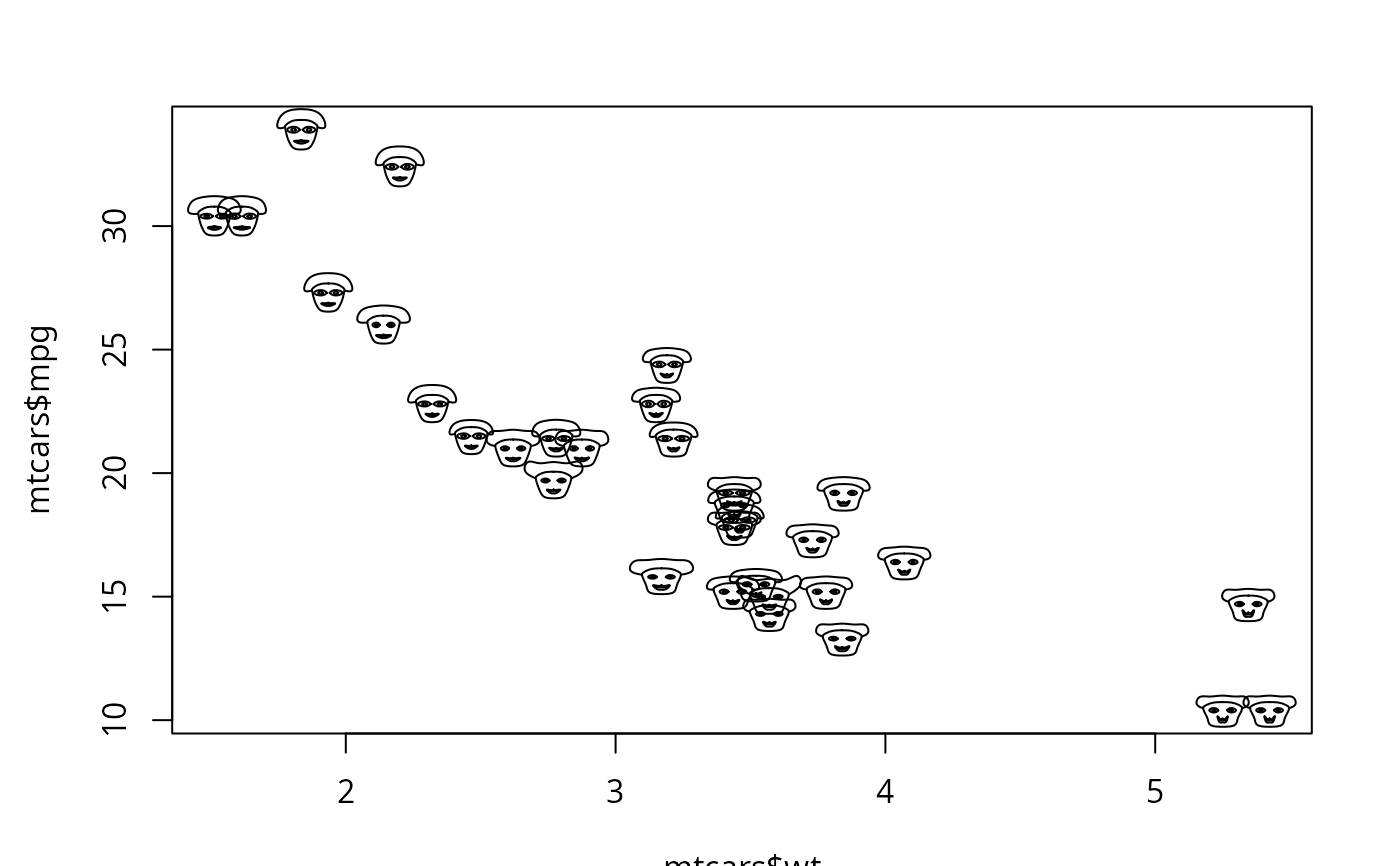 my.symbols(mtcars$wt, mtcars$mpg, ms.face, inches=0.3, features=tmp2.mtcars,