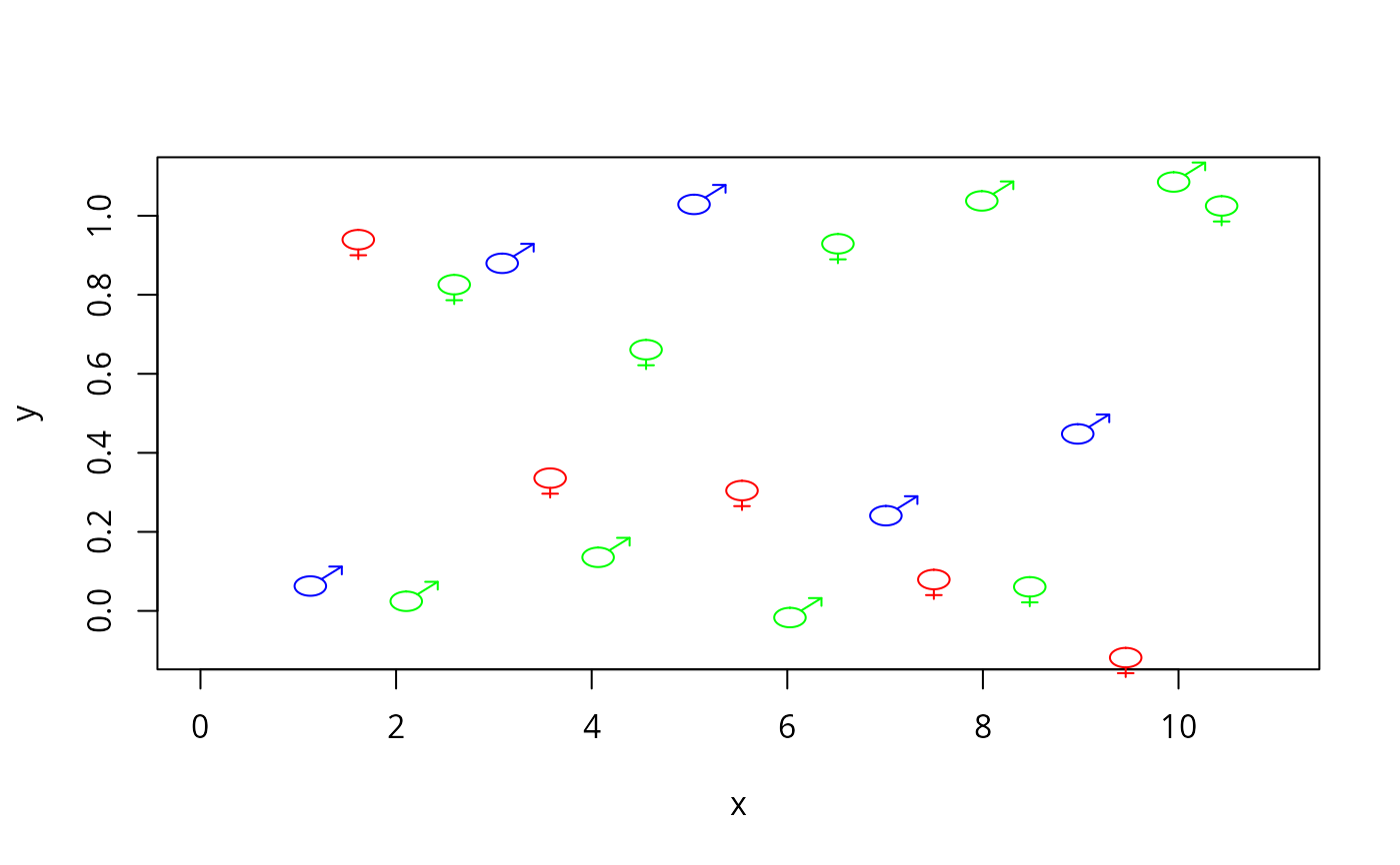 my.symbols( (1:10)+0.5, runif(10), ms.female, add=TRUE, inches=0.3,