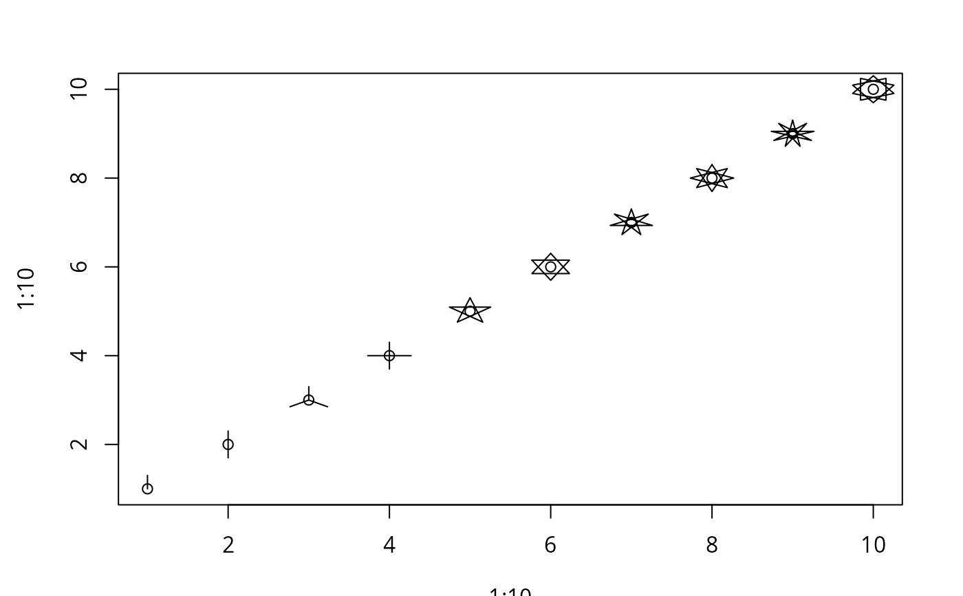 my.symbols( 1:10, 1:10, ms.polygram, n=1:10, inches=0.3 )