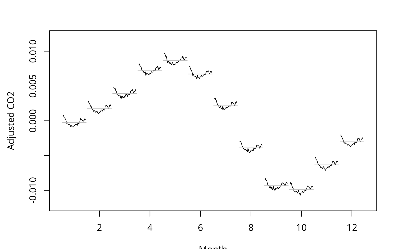 xlab='Month',ylab='Adjusted CO2', xlim=c(0.5,12.5),