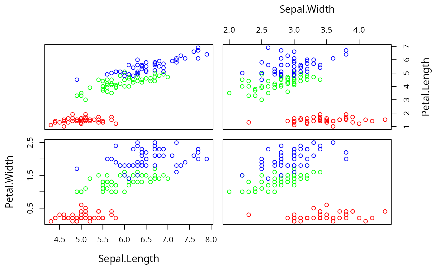 pairs2(iris[,1:2], iris[,3:4], col=c('red','green','blue')[iris$Species])