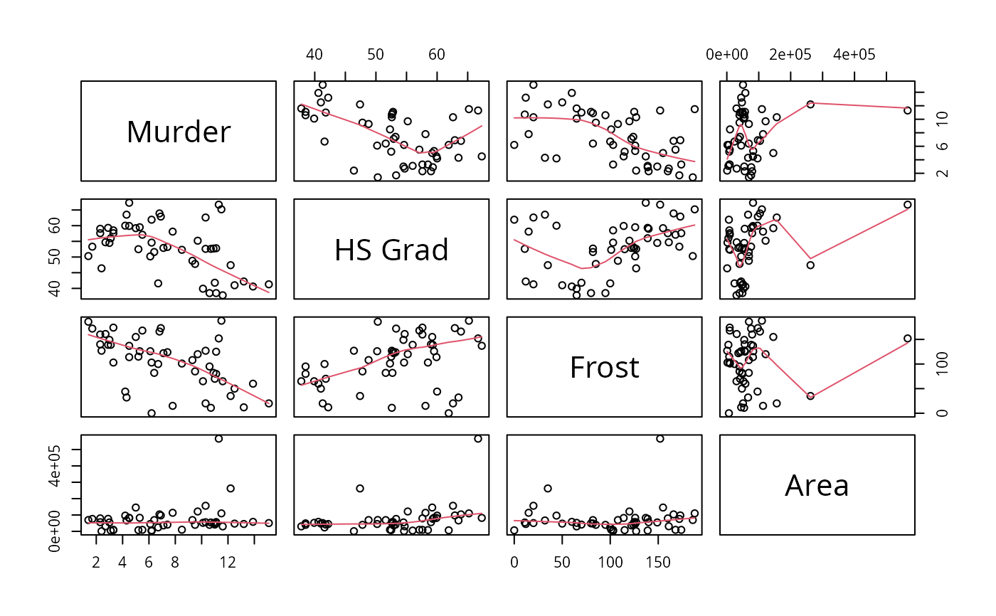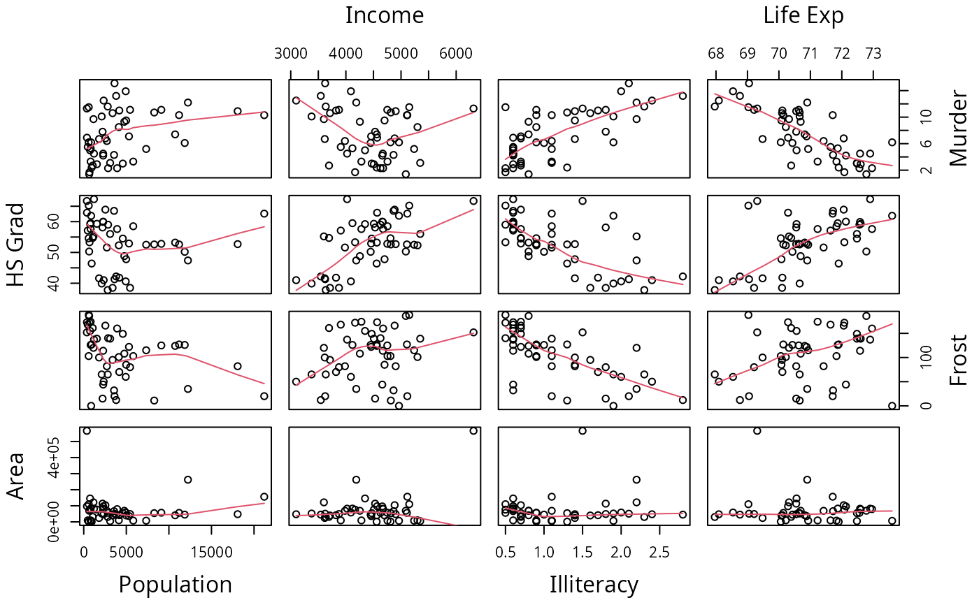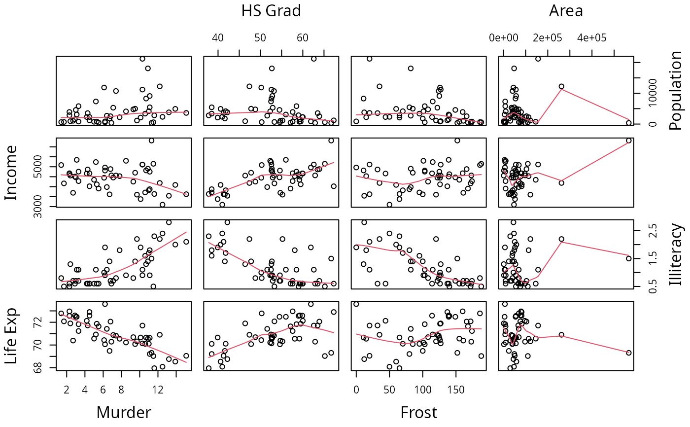 pairs(state.x77[,5:8], panel=panel.smooth)