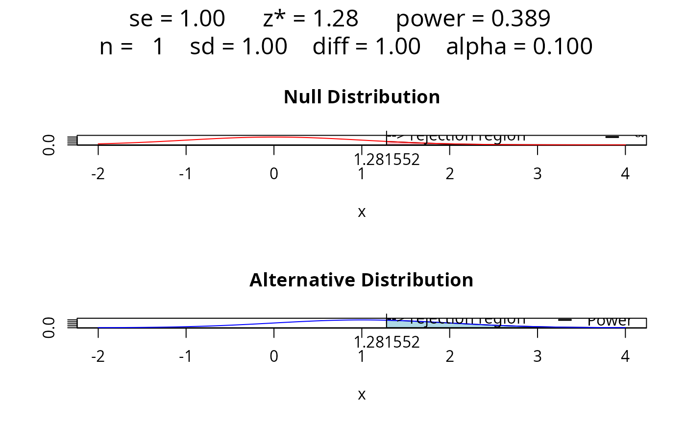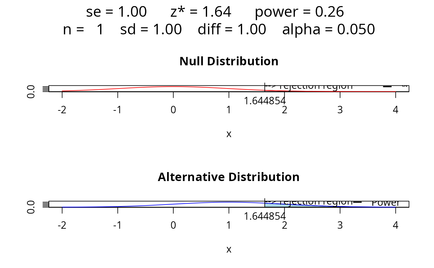 power.examp.RdCreate graphs of a normal test statistic under the null and alternative hypotheses to graphically show the idea of power.